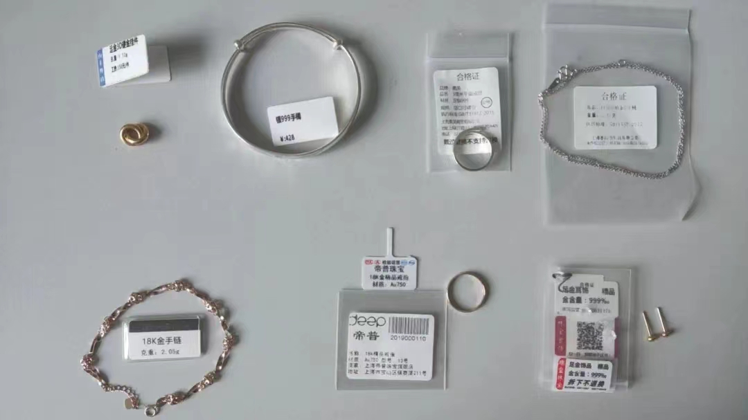 检测项目涉及贵金属纯度(含量)、质量、标识(标签、印记)3项。共7批次标识(标签、印记)不合格,其中4批次标签中包含不符合标准要求的字样,6批次印记缺少厂家代号。
