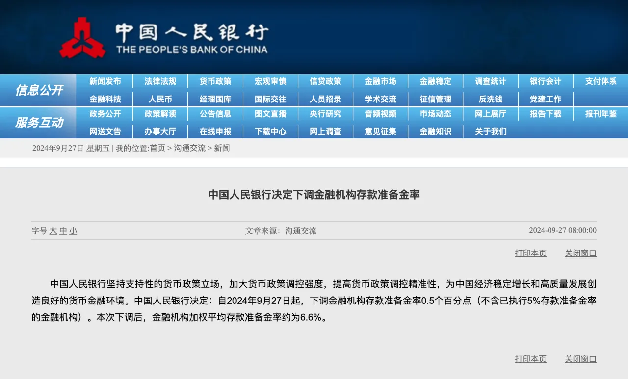 央行宣布!9月27日起,下调金融机构存款准备金率0.5个百分点