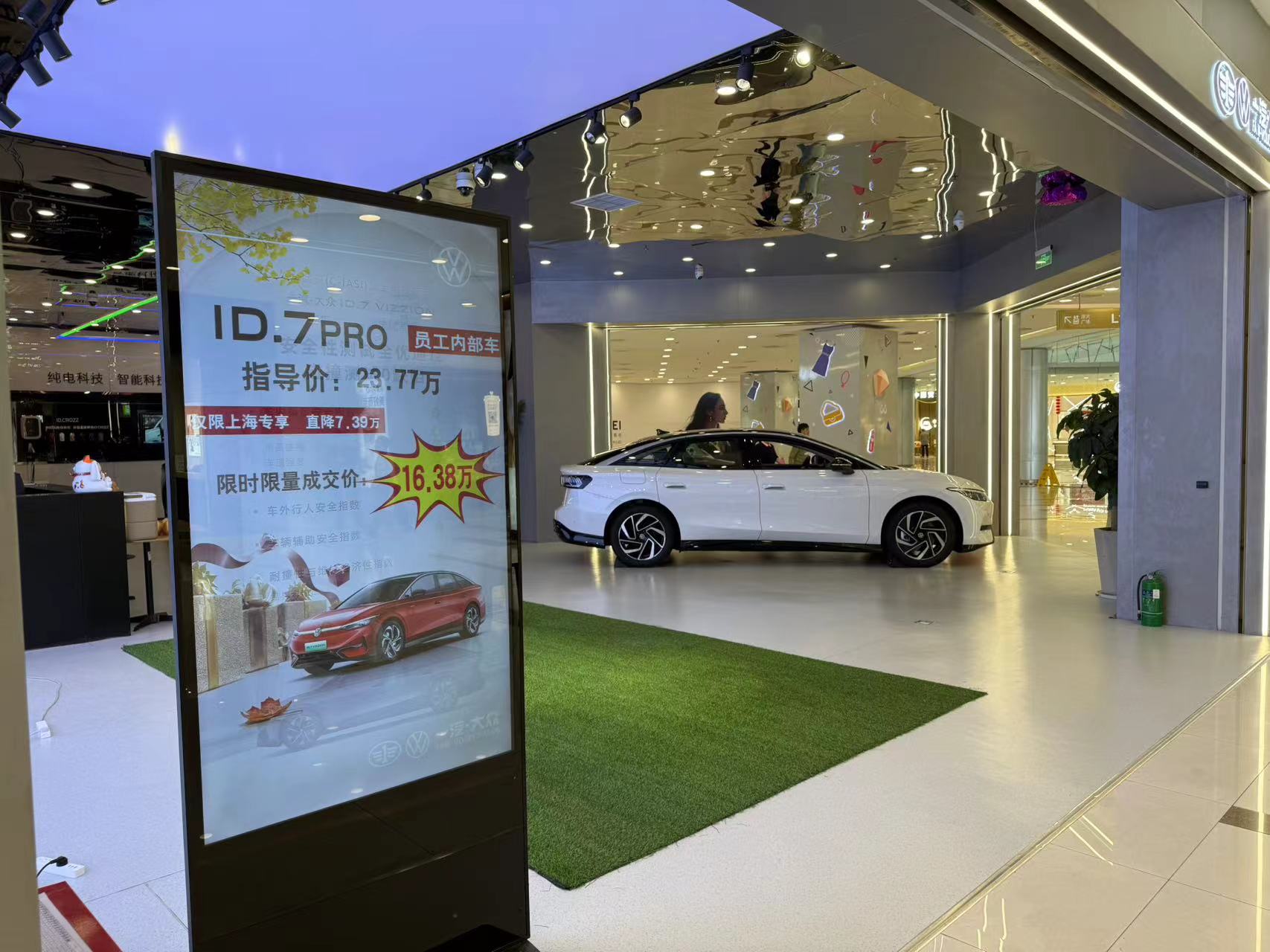 “金九银十”叠加节日、政策效应,新能源汽车市场活力迸发。10月9日上午,记者前往一汽大众ID.HUB新能源体验中心在凯德龙之梦的店内,门厅内停着的一辆白色ID.7PRO版颇为亮眼,展示大屏滚动播放着广告打着“仅限上海专享,直降7.39万”的广告。虽然已经是国庆后的工作日,但店内销售人员仍忙着在微信上接受顾客的咨询。