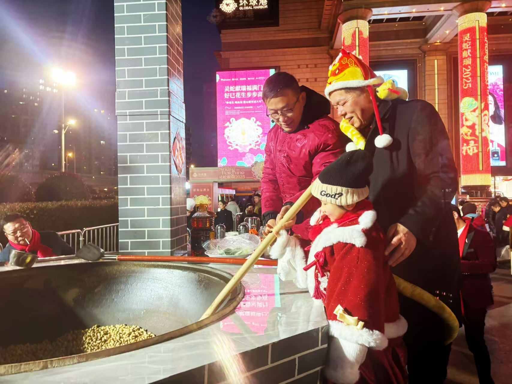 1月27日小年夜傍晚,浦西大型商业综合体环球港开启“灵蛇献瑞福满门 好巳花生步步高”的小年夜民俗活动。现场炒花生、炸春卷、蒸年糕、烤全牛、喝鱼汤......共同庆祝小年夜的团圆时光。