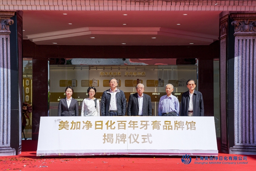 头图:第十届上海市政协主席蒋以任、上海市工业经济联合会会长管维镛、徐汇城投集团总审计师周杰、上海市商务委相关负责同志余佳、原上海牙膏厂厂长徐英威、上海美加净日化有限公司董事长王琴共同为百年牙膏品牌馆揭牌。受访对象供图