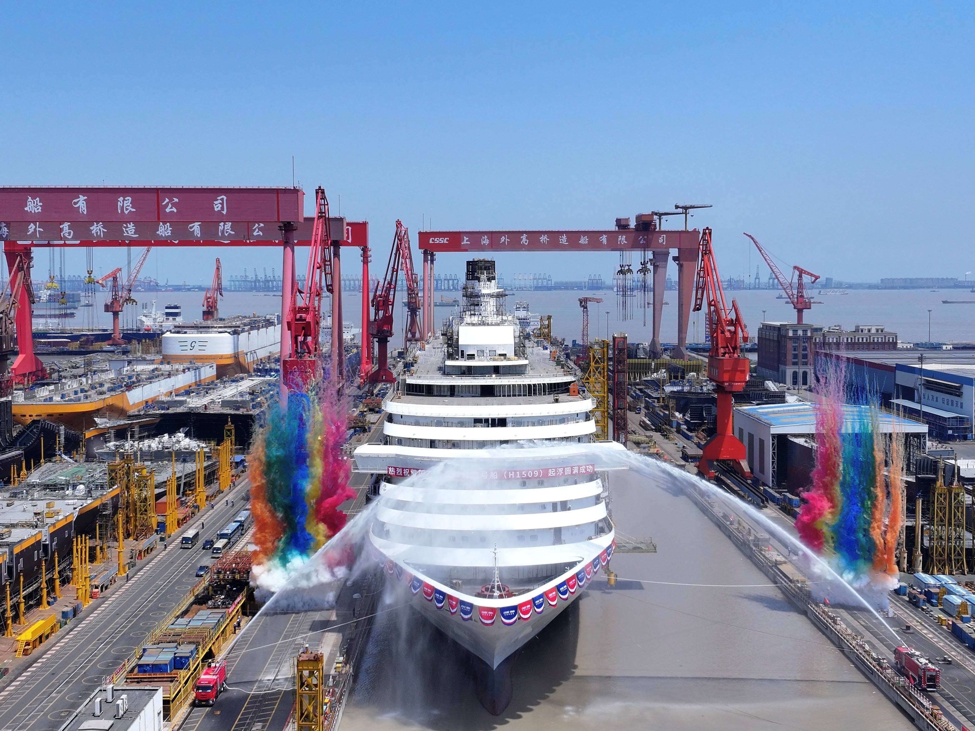 头图为“爱达·花城号”实现坞内起浮。外高桥造船供图
