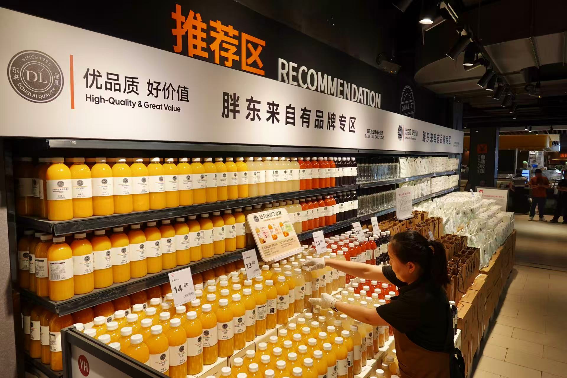 门店还专设胖东来自有品牌专区,引入自由・爱白酒、DL燕麦片、DL洗衣液、DL复合果汁、DL精酿啤酒等爆款,嘉定市民在家门口就能买到胖东来品质好物。