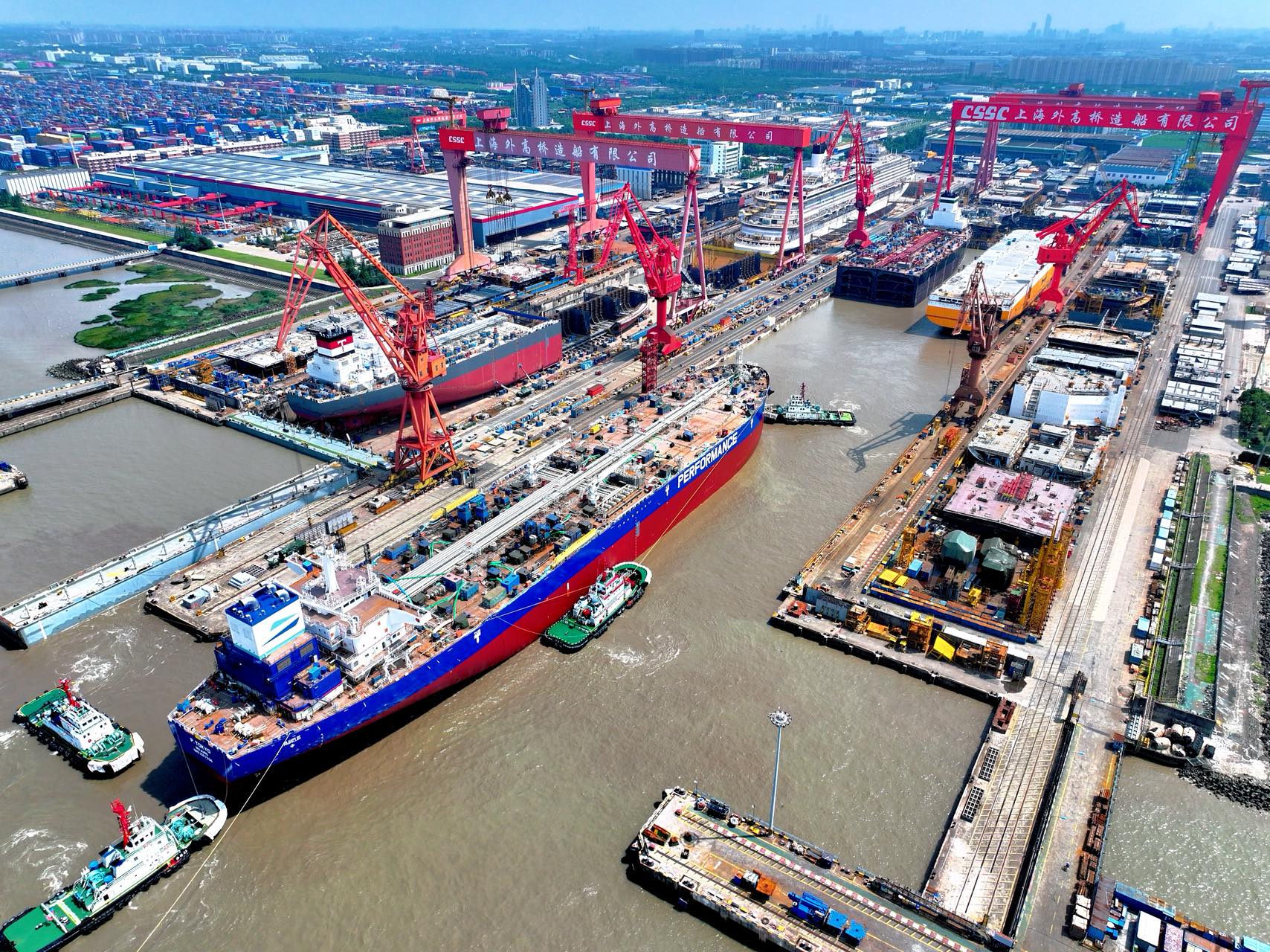 6月25日,中国船舶集团有限公司旗下上海外高桥造船有限公司建造的9000车汽车运输船(PCTC)和11.4万吨阿芙拉型成品油轮同日出坞。