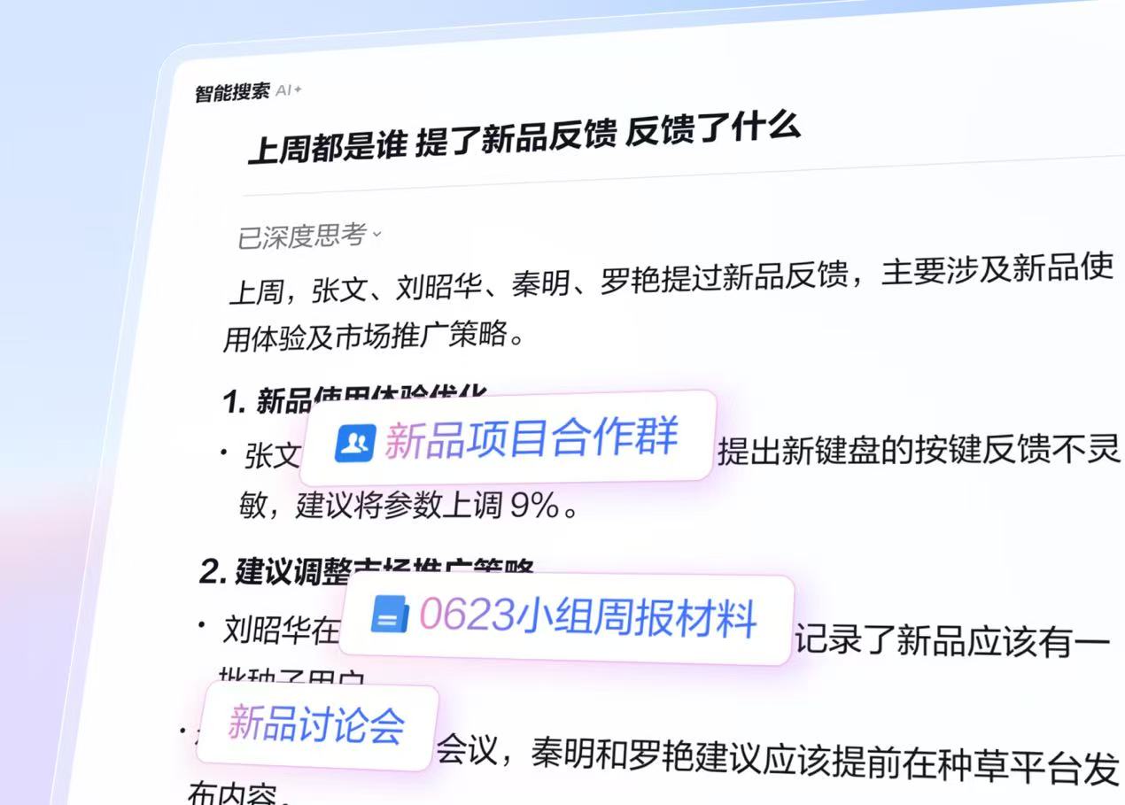 具体而言,智能搜索支持口语化提问,自动关联聊天、文档等场景,精准定位信息并汇总数据,解决记忆模糊、信息分散的问题;智能总结则自动整合群聊、文档、会议记录生成项目进展报告,跳过中间环节,且基于自然工作流提炼客观结论,帮管理者高效决策;智能机器人可学习企业业务 SOP、规章制度等内容,实现零门槛问答,还开放API接口打通业务系统,方便员工快速获取信息。值得注意的是,这些AI功能的数据仅限企业内部流转,还支持本地私有化部署,确保企业信息资产自主可控。