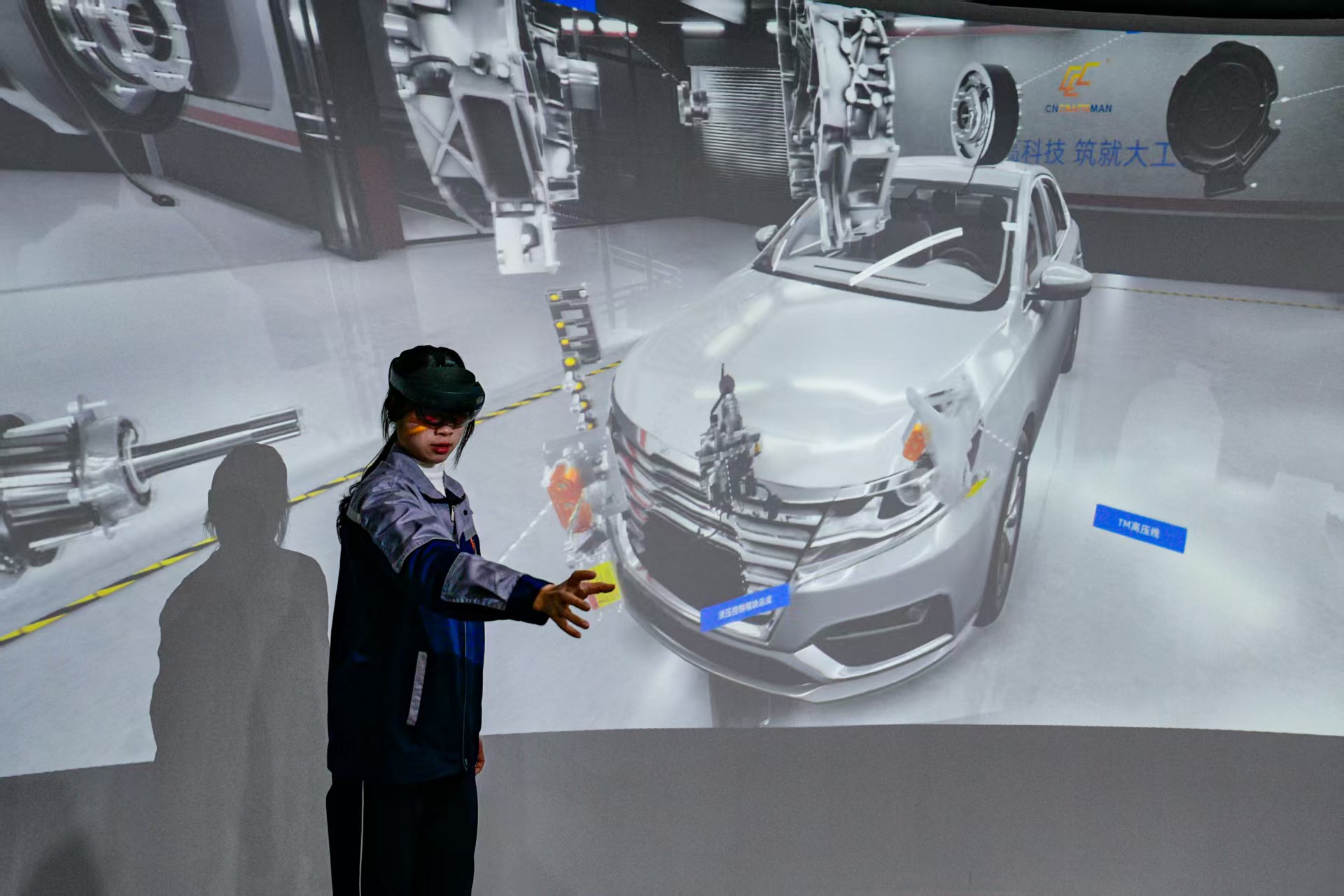 依托“5G+XR”技术,学院打造了跨专业教学场景矩阵。智能汽车服务系学生佩戴AR眼镜即可看到汽车内部结构的虚拟标注与拆装指引;数字创意系研创中心支持VR团队协同创作,师生共同开发的数字人“小意”成为教学融合的生动载体。实训管理平台通过分析操作时长、错误次数等数据生成个性化报告,实现“学训考”一体化延伸。该模式不仅助力师生在多项教学赛事中获奖,还作为“上海市全民数字素养与技能培训基地” 每年接待超1500人次体验,相关成果获评2024年上海市典型案例。