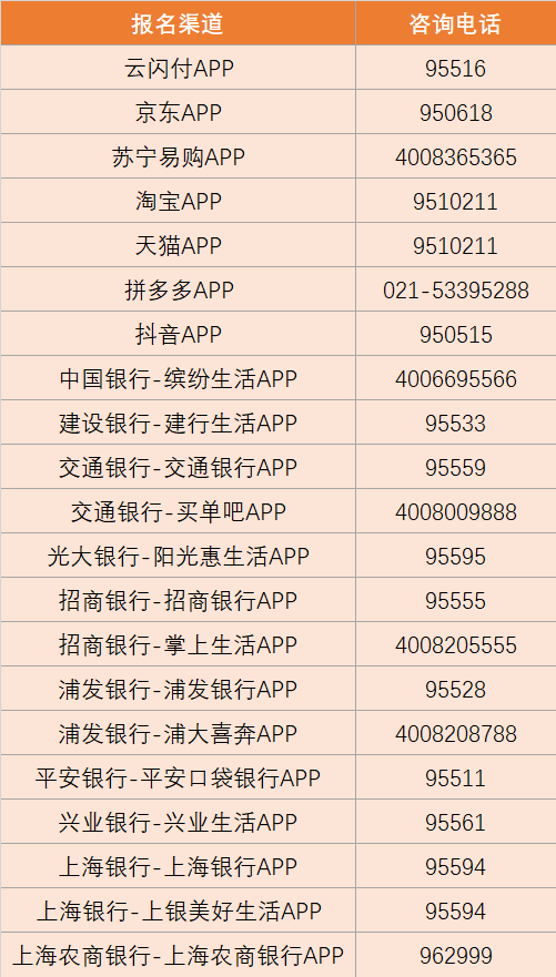 个人消费者可在规定时间内登陆云闪付、京东、苏宁易购、淘宝、天猫、拼多多、抖音、中国银行、建设银行、交通银行、光大银行、招商银行、浦发银行、平安银行、兴业银行、上海银行、上海农商银行等APP的报名渠道选择所需品类报名。