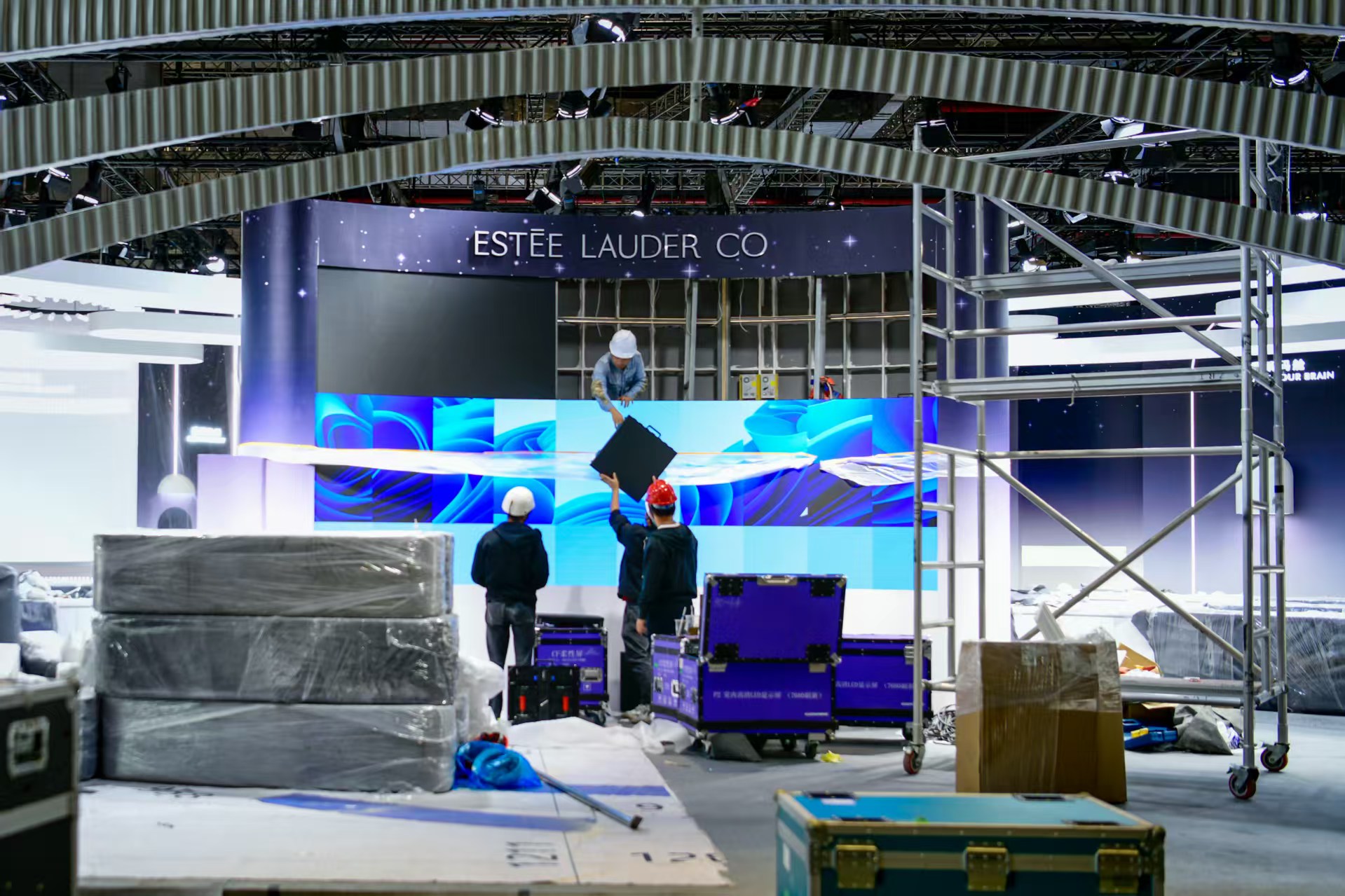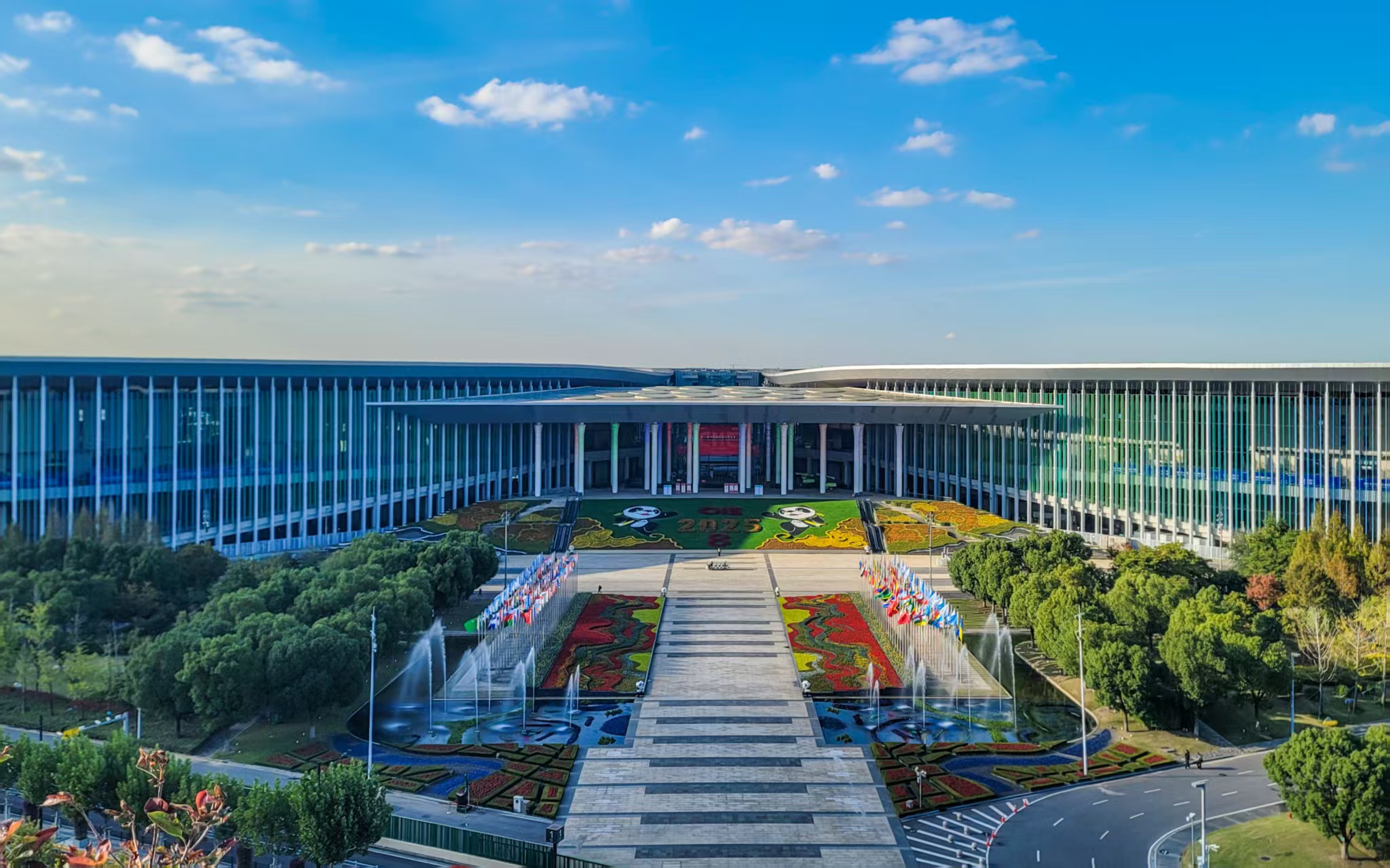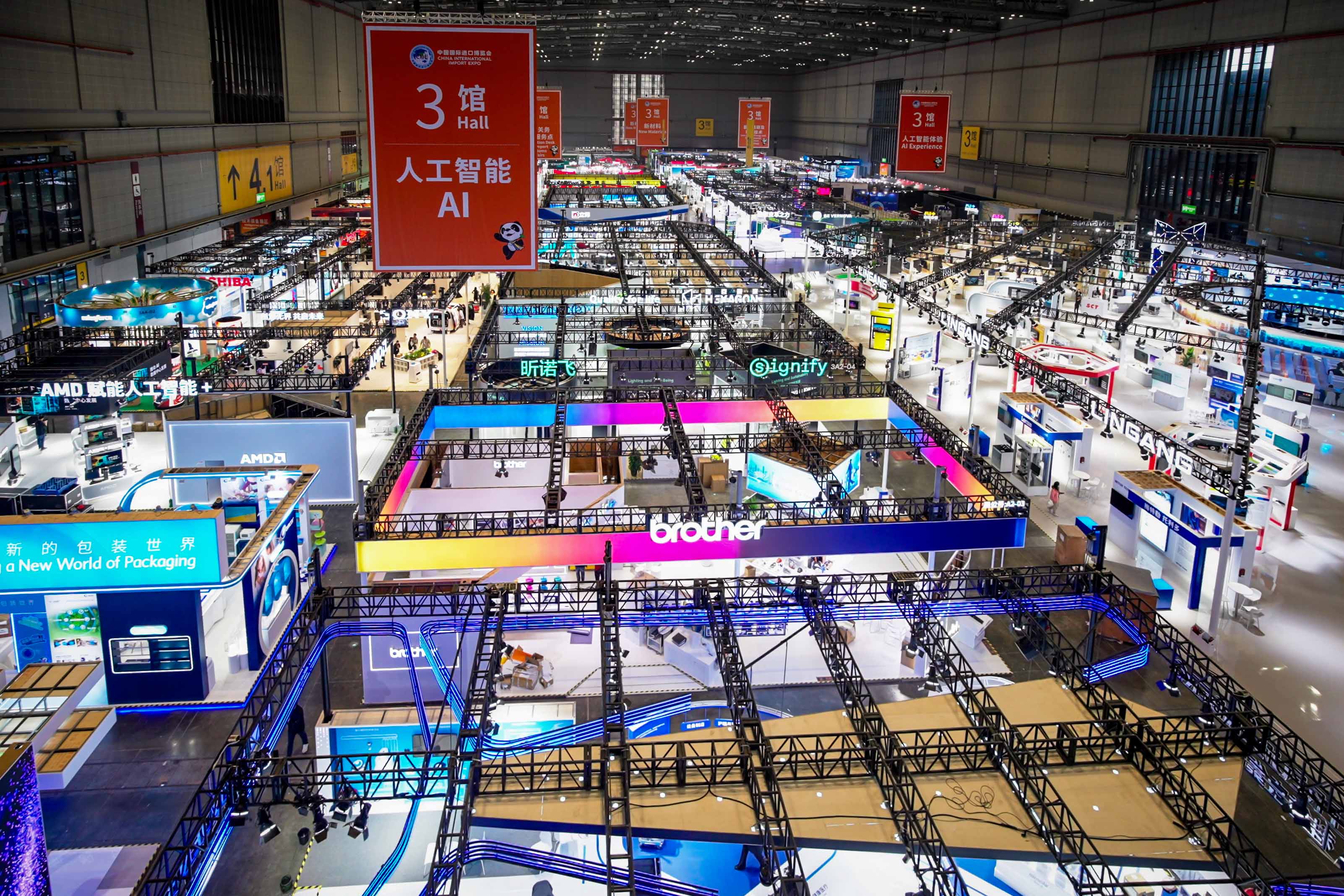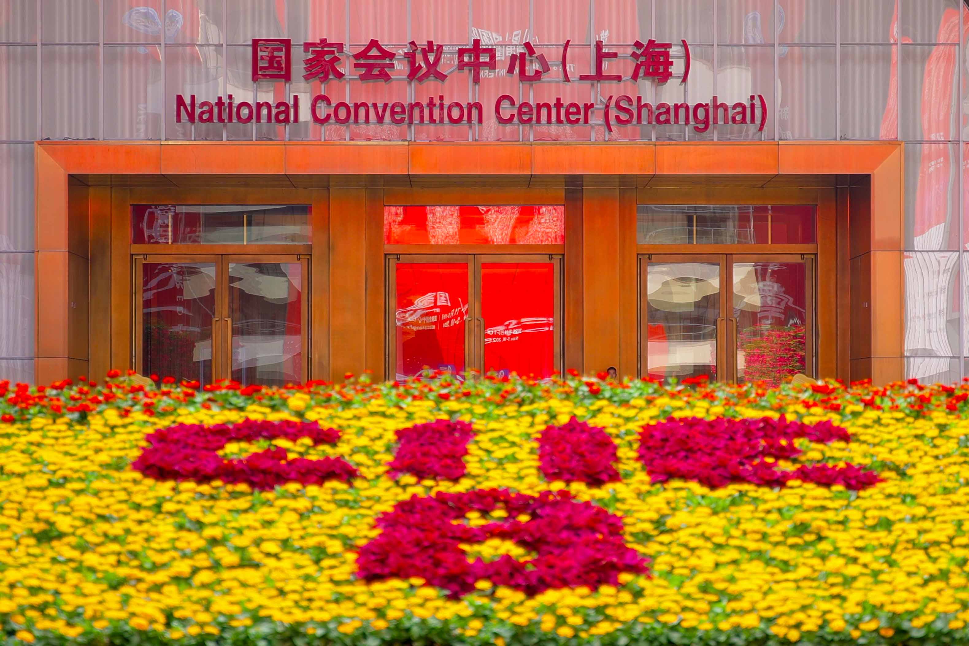 近日,国家会展中心(上海)的外观装饰及场馆周围景观布置工作基本完成。截至11月2日,各展台搭建工作已全部完成,展品布置正在有序进行中 。