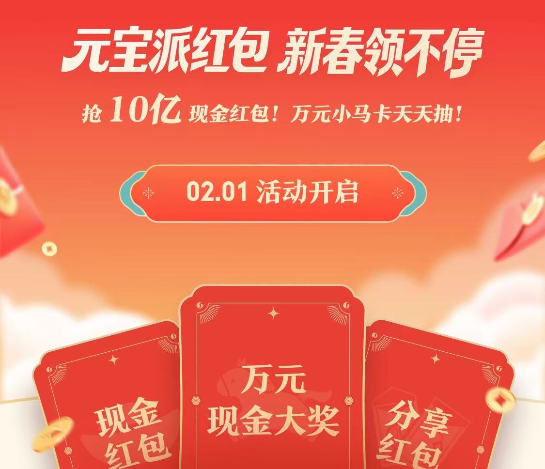 1月25日,腾讯官方率先官宣,将于2月1日在元宝App上线春节10亿现金红包活动,单个红包金额最高可达万元,重现十年前微信“摇一摇”红包的强势营销姿态。用户将元宝App更新至2.55.0及以上版本预约活动,可额外获得10次抽奖机会,活动设置万元小马卡、分享红包等多种形态,支持转发至微信、QQ社群裂变传播。但10亿现金背后,是腾讯的AI布局野心,当日同步开启内测的“元宝派”社交AI玩法,打破传统人机交互局限,打造多元社交空间,用户可创建社群并借助AI实现聊天总结、趣味创作等功能,试图以社交优势为AI产品破局。