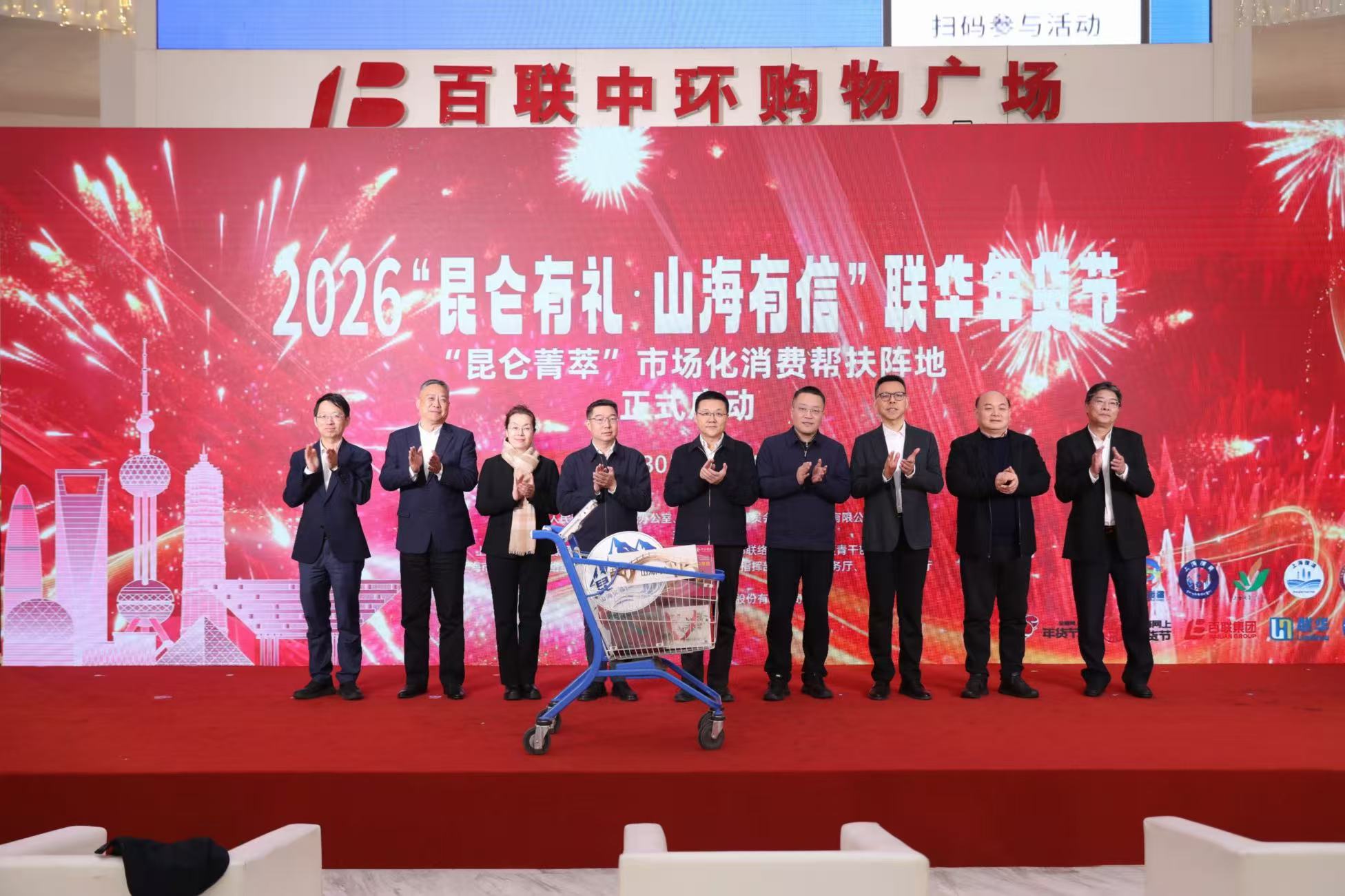 1月30日,由上海市对口支援新疆工作前方指挥部牵头,联合上海市援藏干部联络组、上海市援青干部联络组、上海市援滇干部联络组、上海市对口支援克拉玛依市前方指挥部、云南省商务厅、青海省商务厅主办,上海消费帮扶联盟、联华超市股份有限公司承办的2026“昆仑有礼·山海有信”联华年货节暨“昆仑菁萃”市场化阵地启动仪式在百联中环购物广场举行。