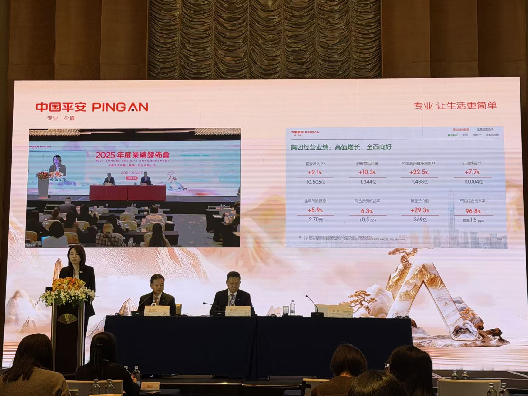 3月26日,中国平安公布截至2025年12月31日止全年业绩。公司实现归属于母公司股东的营运利润1,344.15亿元(人民币,下同),同比增长10.3%。归属于母公司股东的扣非净利润1,437.73亿元,同比增长22.5%。归属于母公司股东权益首次突破万亿,达10,004.19亿元,较年初增长7.7%。用心回报股东,公司拟派发2025年末期股息每股现金人民币1.75元;全年现金分红总额488.91亿元,连续14年保持上涨。寿险及健康险业务保持增长态势,新业务价值368.97亿元,同比增长29.3%。保险资金投资业绩优良,实现综合投资收益率6.3%。