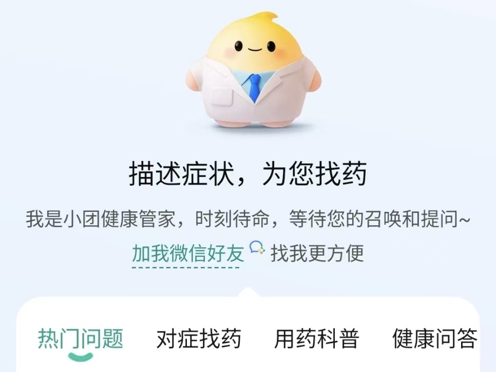 区别于市面上的通用AI健康问答产品,“小团健康管家”的关键差异在于“问完能做”——用户在对话中可跳转线上购药、在线问诊或预约线下就医,形成从咨询到履约的完整闭环。目前该产品已接入微信渠道,后续将支持群聊接入。