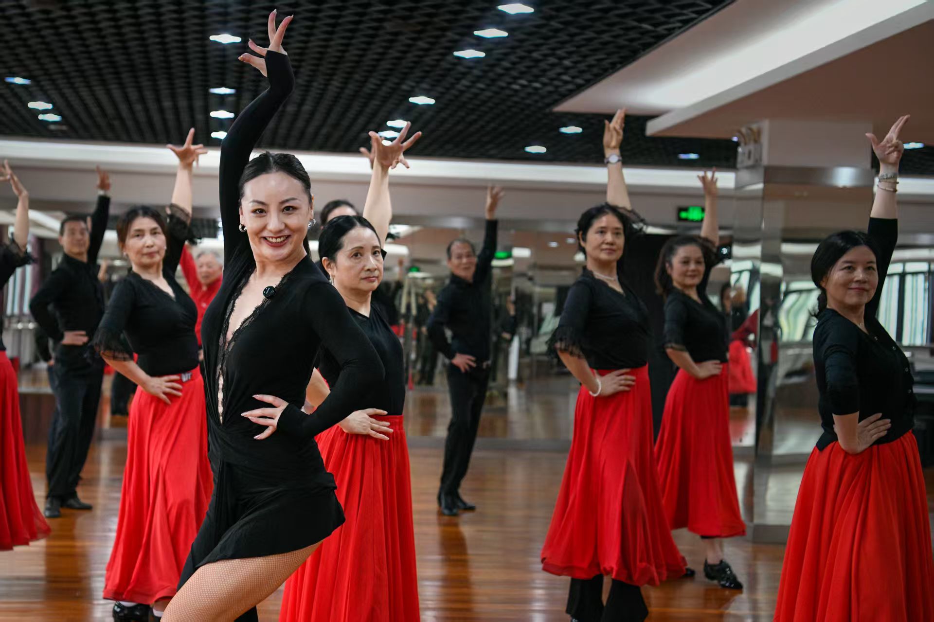 万易正在教学员们跳斗牛舞,劳动报记者颜筱依摄