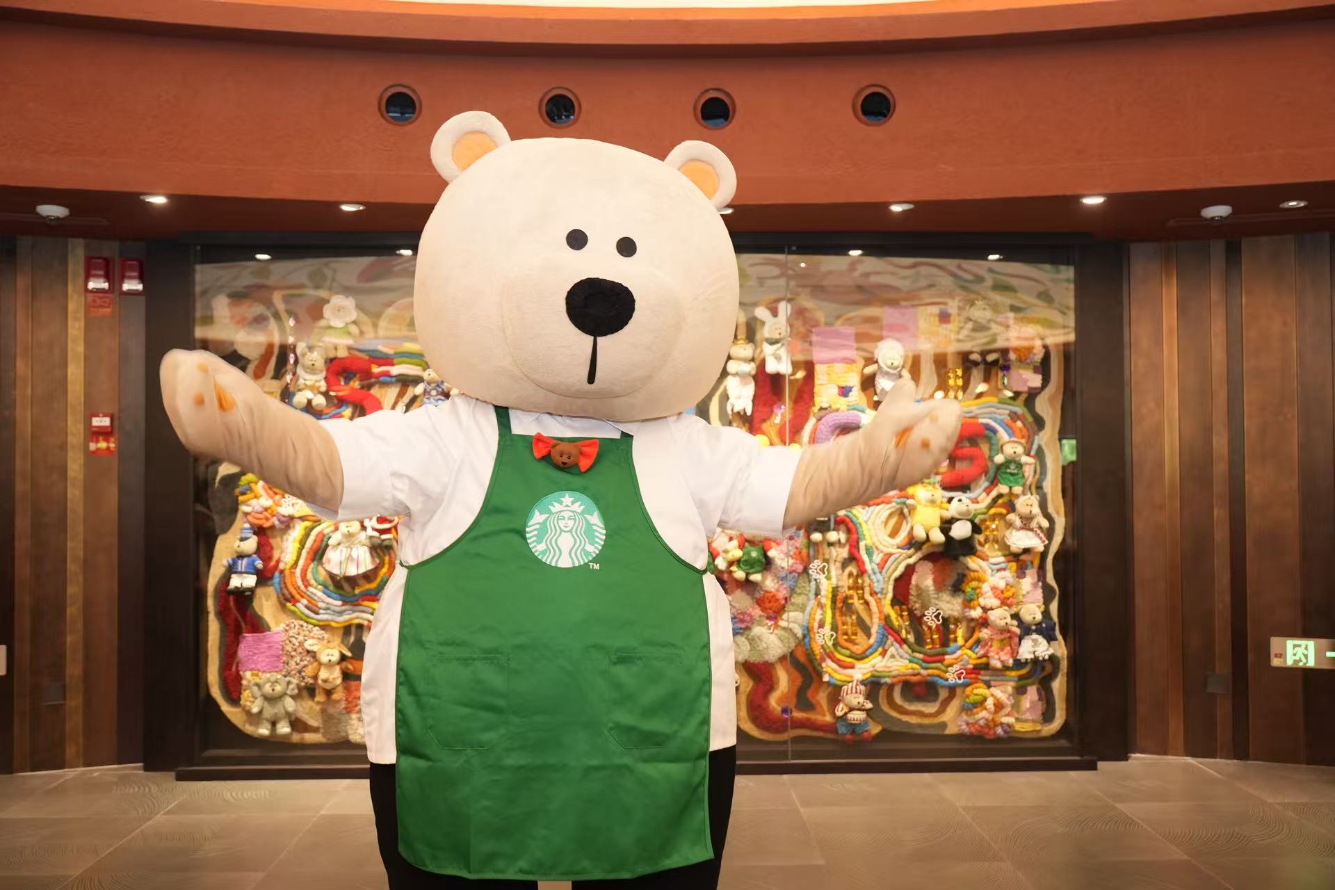 穹顶之下,全新设计的“庄园舞会”主题空间里,缤纷的花卉与咖啡树枝交织成梦,让每一处角落都充满童趣,来自全球咖啡原产地的灵鸟与小动物穿梭于咖啡叶与花丛之间,与游客一起尽享星巴克咖啡庄园的舞会的狂欢。身高2.1米的绿围裙熊店长,作为“舞会主人”站在C位,俏皮地挥动手臂邀请每一位顾客加入这场咖啡与童话的狂欢;而由33只来自星巴克全球各地的限量熊店长组成的“小熊墙”,则用来自世界各地的文化符号,欢迎大家的到来。