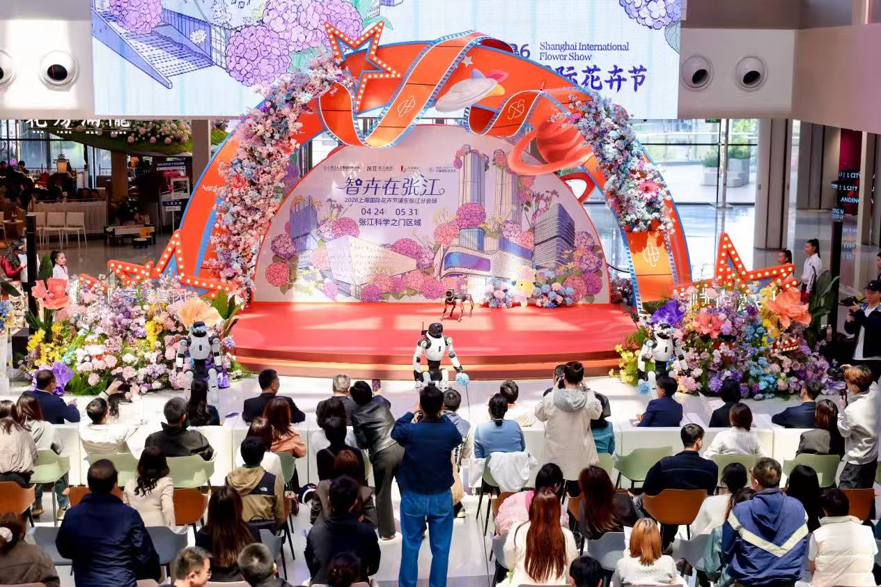 当天下午,张江人工智能创新小镇陆悦天地土星3楼中庭春意盎然,一场独具科创特色的机器人暖场表演率先登场,提前引燃现场气氛。随后,在主持人铿锵有力的宣告声中,本届2026上海国际花卉节浦东张江分会场正式启幕,一场兼具科技质感与自然之美的春日盛宴,正式与各界嘉宾、市民见面,为科创张江的春日增添了别样风采。