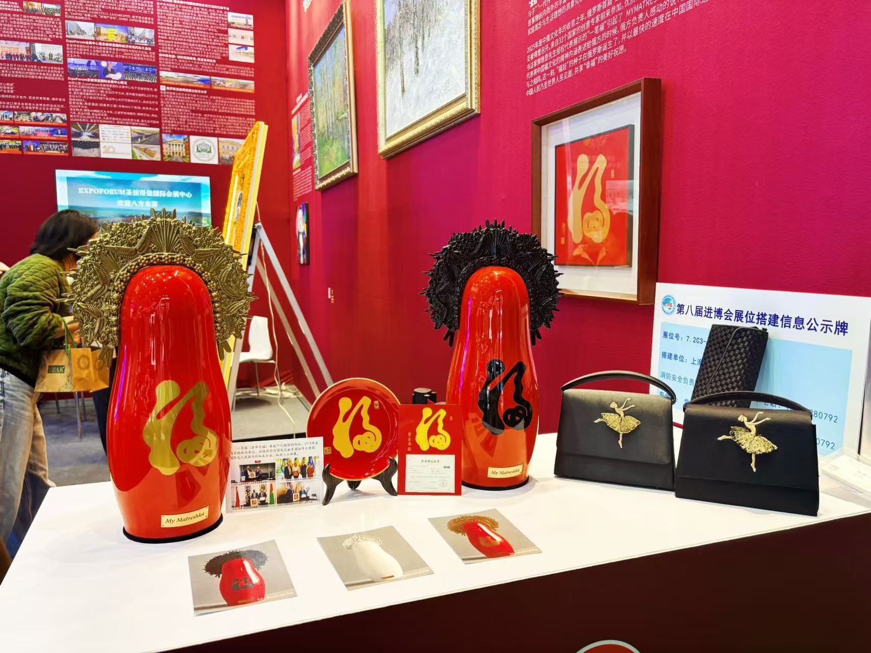 展台现场,由俄中商务中心(俄罗斯)上海代表处牵手俄罗斯著名创意品牌MYMATRESHKA携手中国著名书法家郭继恩先生联合打造的“福娃”系列经典文创产品,受到观展者的关注。福的精神内涵是对美好生活的向往与追求,涵盖了平安、健康、富足、吉祥等多元幸福愿景。它不仅是对物质生活丰裕的期盼,更包含对精神层面安宁顺遂的渴求,是中国人朴素价值观与生命理想的集中体现,承载着对家庭、社会及国家和谐美满的祝愿。