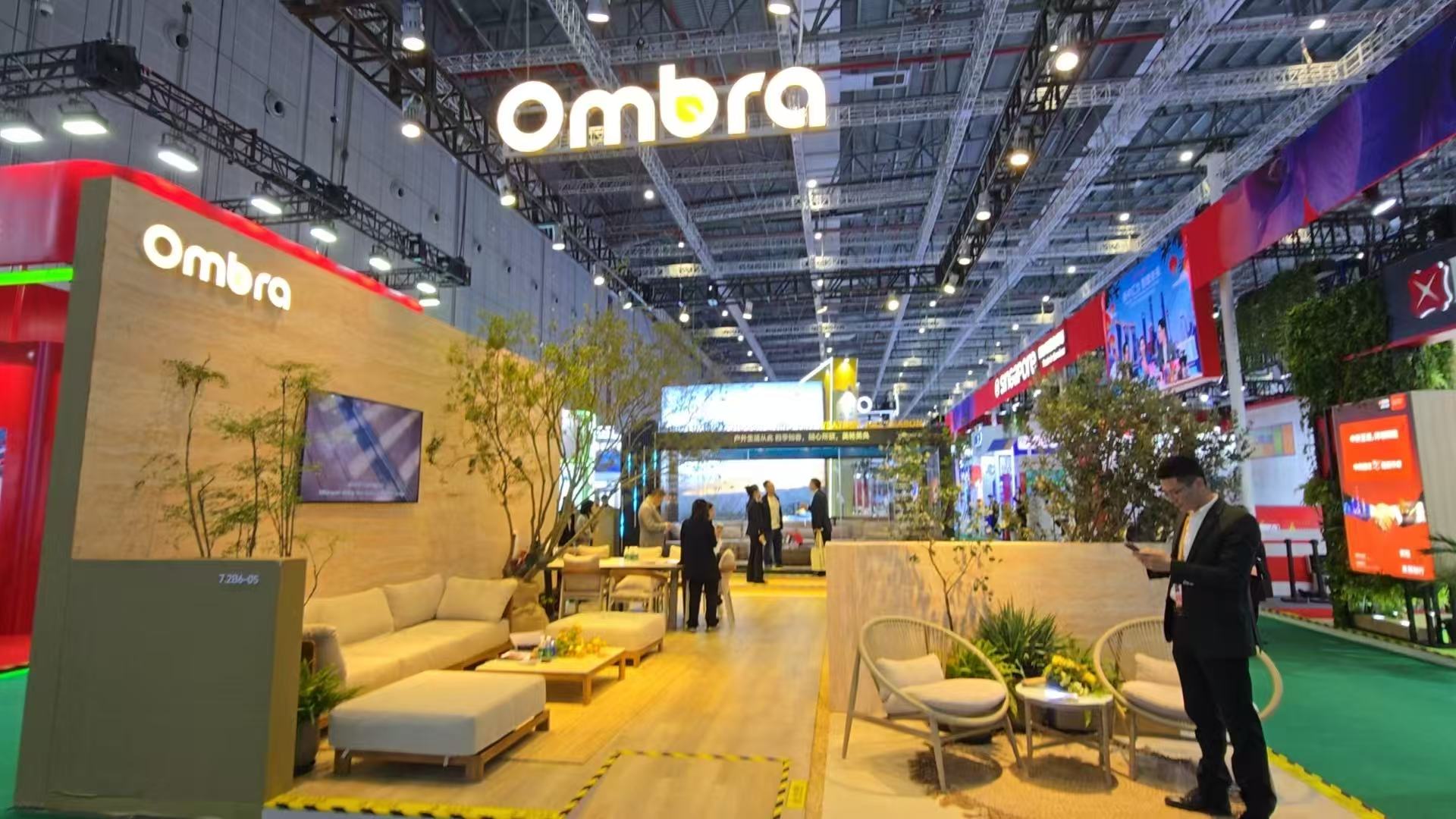 劳动报记者注意到,本届进博会上,Ombra(欧铂纳)展台总面积达到108平方米,较去年的60平方米扩大近一倍。其展台位置也由服务贸易展区的边缘处,搬到了展区中心的C位,紧邻服务贸易领域的文旅板块。智能观景棚置入的同时,沙发躺椅的“配置”也为观众提供了更宽敞、舒适的观展空间。