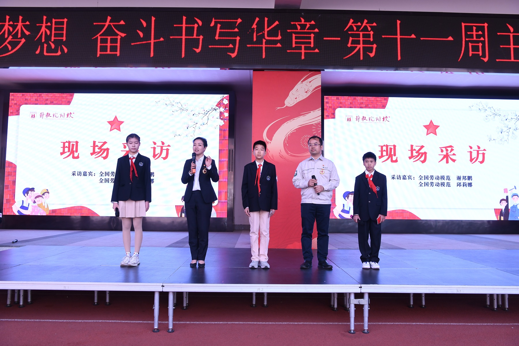 活动高潮出现在表彰环节。15名“附校小劳模”昂首登台,谢邦鹏、邱莉娜两位“大劳模”为“小劳模”戴上大红花,也把劳模精神传递给同学们。“小劳模”洪辰乾、廖晴朗向全校同学倡议“爱劳动、勤劳动、会劳动”,获得了全校同学们的热烈掌声。