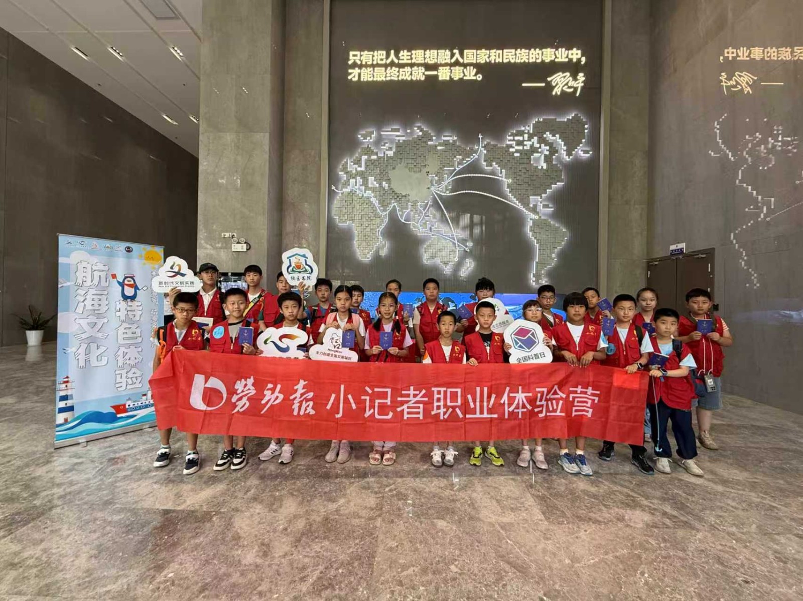 上海因海而生、凭海而兴。作为上海海洋意识教育、航海知识科普、船员文化传播的重要功能窗口,上海海事局船员考试中心因地制宜,建设了船员文化走廊和“蓝色国土红色航迹”科普文化展厅,讲好上海航员故事。来自船员考试中心的讲解员声情并茂地为同学们讲述了中国航海业的历史,并介绍了当前中国航运的情况。在修身励志讲堂,大家跟着中心老师认真学习了打水手结、旗语电码等。同学们拿着活动开始时分发的“未来航海家护照”,在每一个环节结束后加盖了印有航海图标的印章,标志着他们对蔚蓝海洋知识的探索和学习。