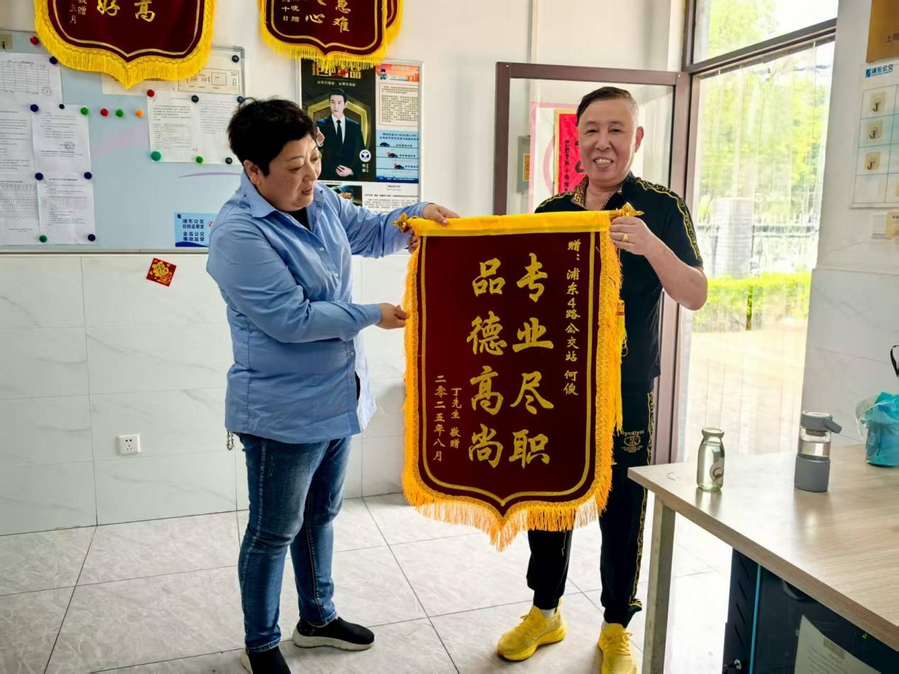 近日,市民丁先生专程来到东陆路利津路终点站的调度室,将一面印有“品德高尚 专业尽职”的锦旗送到驾驶员何俊师傅手中,感谢他的拾金不昧。