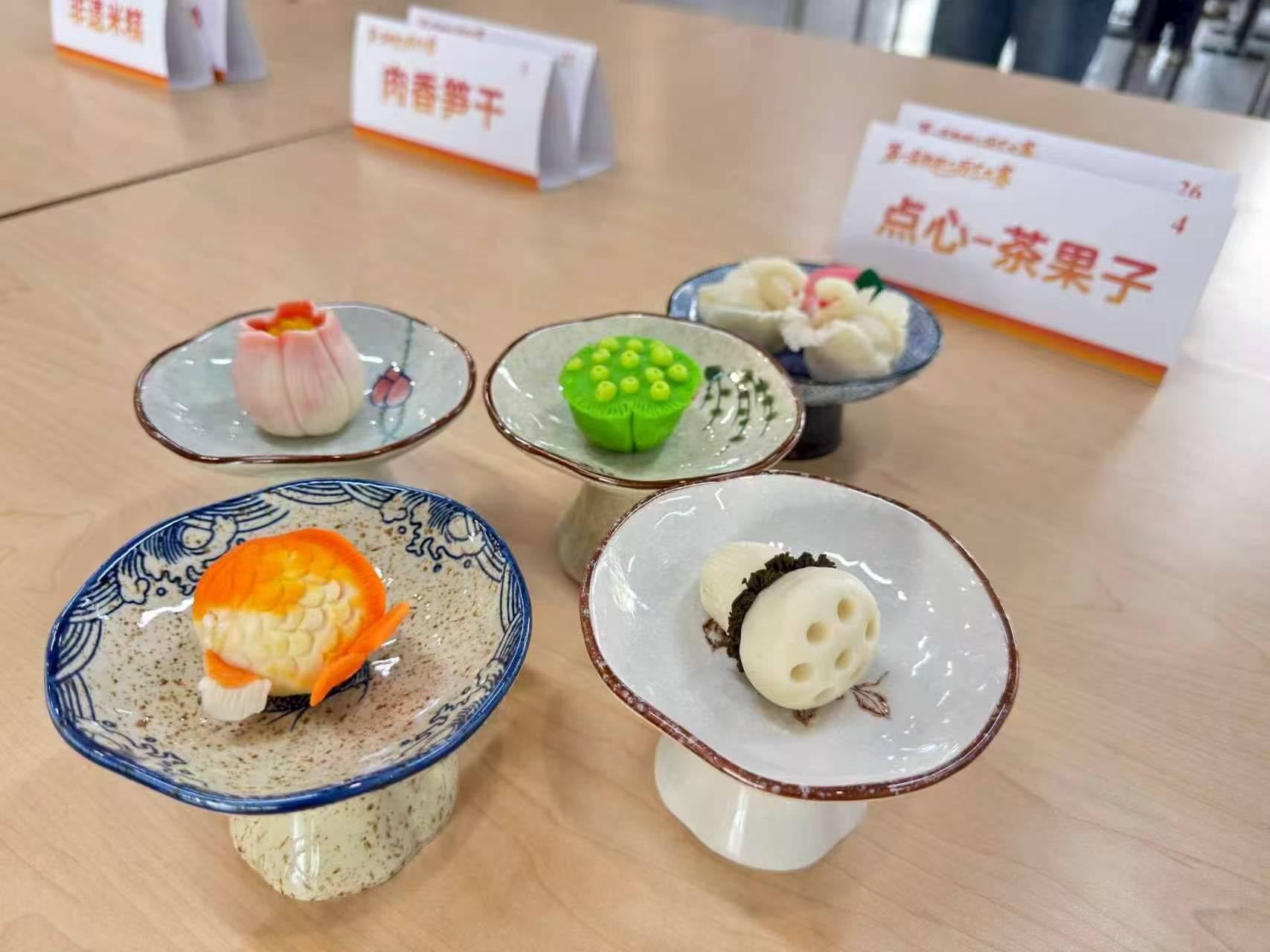 赛道一“自带菜品·加热品鉴”共有29位老师参赛,带来29道各具特色的精美菜品,涵盖热菜、凉菜、汤羹、甜品等多个品类,既有充满地域特色的家乡风味,也有融入创意巧思的创新菜品。参赛老师提前精心制作菜品,现场完成加热摆盘,每道作品都兼顾美味、营养与颜值,充分展现了教职工们精湛的烹饪技艺和对生活的热爱。获得一等奖的景婧老师来自国际商务外语学院,为了传播中华优秀传统文化,她专门学习了这门手艺,此次参赛的作品也是课程成果之一。她说,“常言知行合一,劳动之美在于心手相契。茶点佐一盏清茶,不过是将书中风物揉进一方粉糯。专业之趣,不在案头,而在市井烟火、三餐四季。热爱生活,方懂得热爱学问。