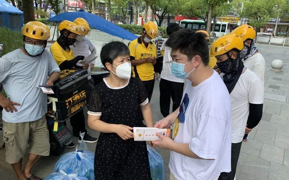 此外,青浦区夏阳街道总工会也对街道内的网约送餐员群体进行了高温慰问和走访。在凯特利广场,街道总工会相关负责人慰问美团站点网约送餐员。慰问现场,街道工会负责人还下发了《青浦区总工会灵活就业群体服务指南》,动员网约送餐员们积极扫码入会并上缴会费,参加灵活就业会员D类专享保障,享受工会组织更多更好的福利。