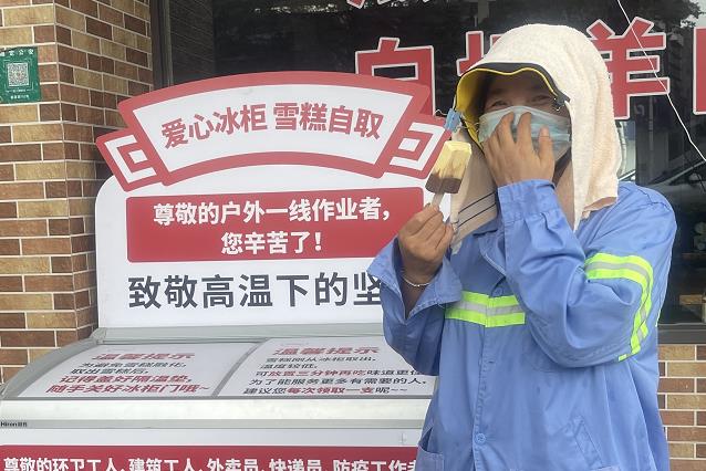 “一起就近吃免费雪糕啦!”今日“处暑”,上午十点烈日当空,环卫工人们结伴走向周边小店的爱心冰柜,领取一根免费的钟薛高。炎炎烈日,雪糕清凉,甜蜜从味蕾蔓延至心底,缓解了环卫工人们工作的疲惫。
