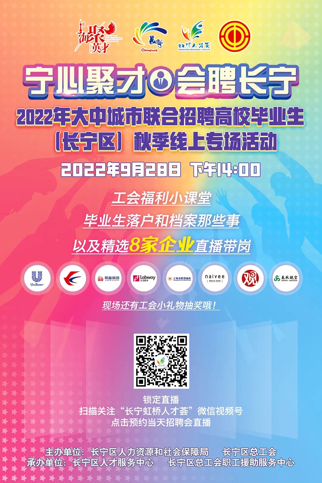 9月28日,长宁区人社局将携手区总工会举办“宁心聚才·会聘长宁”2022年大中城市联合招聘高校毕业生(长宁区)秋季线上专场活动,为高校毕业生及用人单位搭建便捷双向、高效的招聘平台。