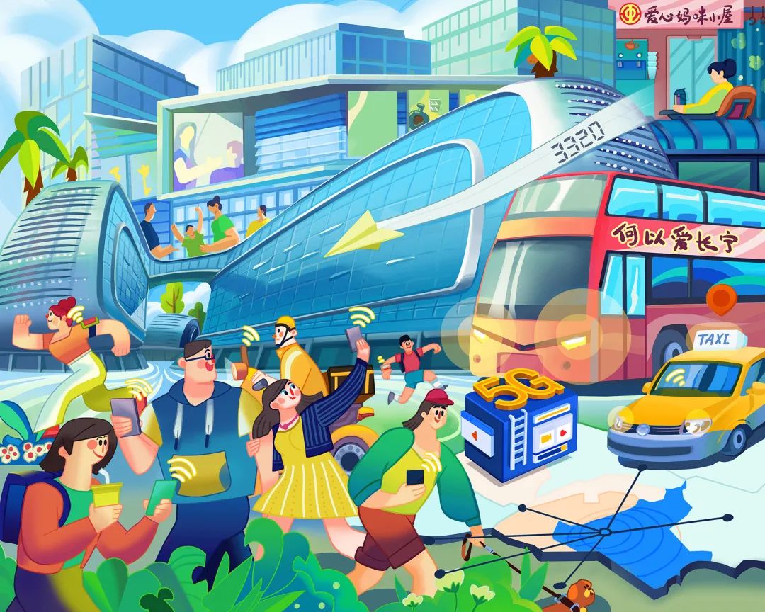 本幅插画以虹桥临空经济园区、东虹桥中心为主体,展示长宁打造“更具竞争力的开放之城”和“更富创造力的智慧之城”的奋斗目标。同时还融入了工会实事项目“爱心妈咪小屋”,体现“娘家人”人性化的温馨关怀;双层巴士开启城市微旅行,漫步街区、阅读建筑,遇见惊喜,给出“何以爱长宁”的生动答案;突出的长宁“3320”数字战略和5G概念,以及正享受着现代速度、满脸笑意的人群,彰显出“数字长宁”在新时代再起宏图的热忱和决心。