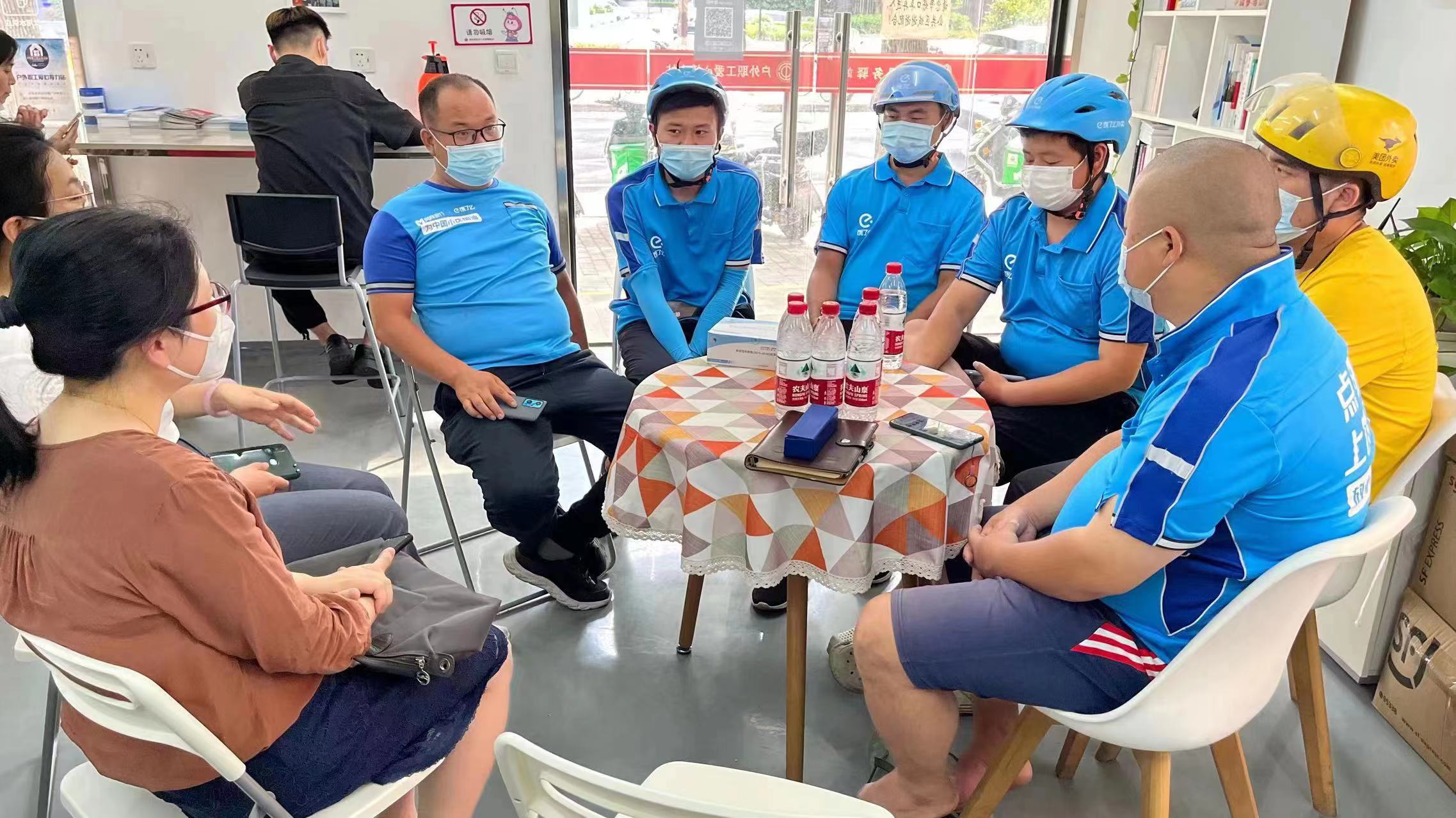 (头图:范小雨(左一)在站点和外卖小哥对谈。本文照片均由受访对象供图)