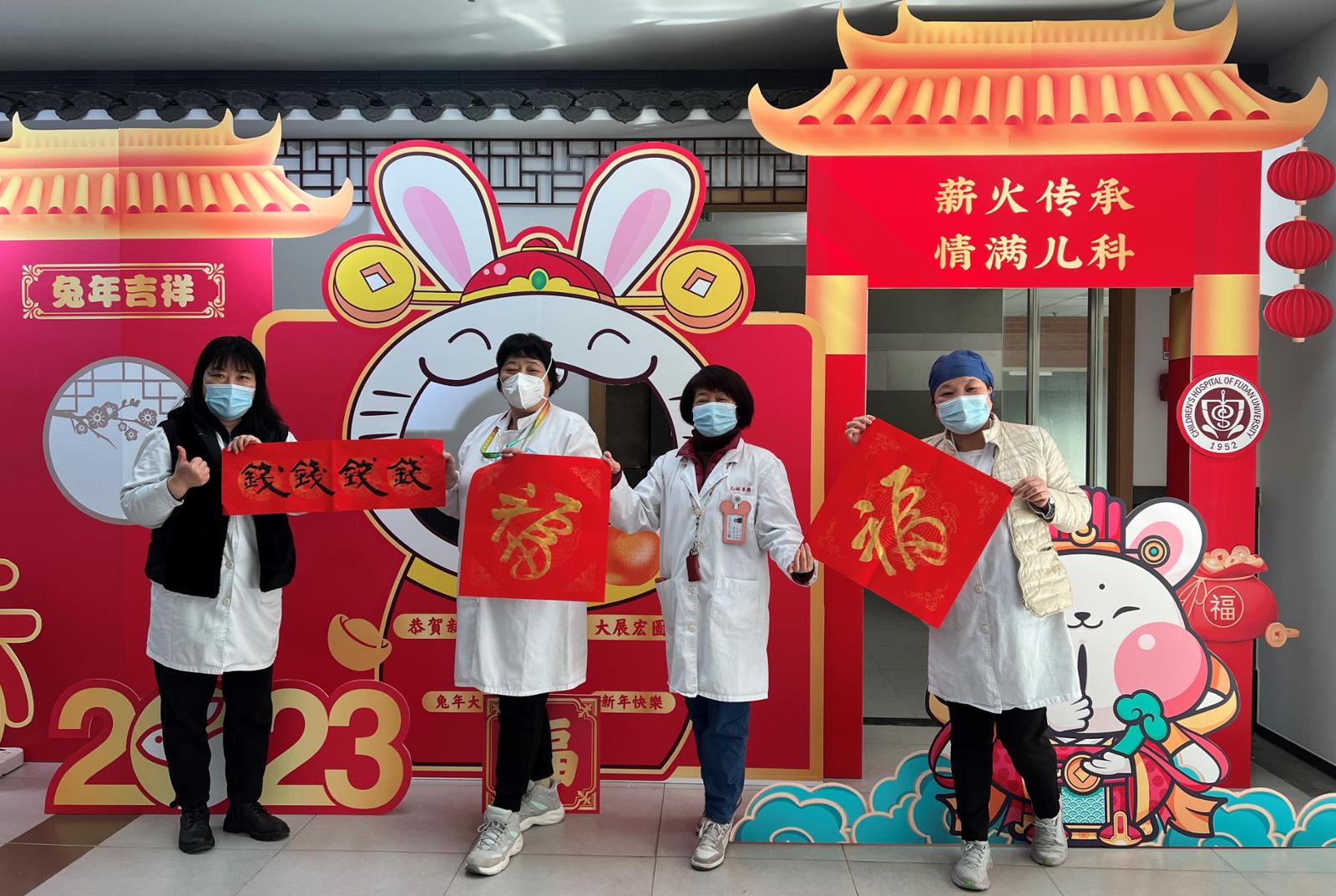 儿科医院工会同样邀请专业书法家,来自百草书画社的书法家为医院职工送上亲手书写的春联。原复旦大学常务副校长、复旦大学上海医学院院长桂永浩、儿科医院党委副书记、工会主席董岿然,儿科医院统战部马巍主任、临床免疫科主任、百草书画社社长王晓川以及历年在上海市医务职工书画比赛和儿科医院书画比赛中获奖职工等书法爱好者现场挥毫泼墨,以中国书法蕴含的文化之美抒发迎新春贺新年的喜悦之情。