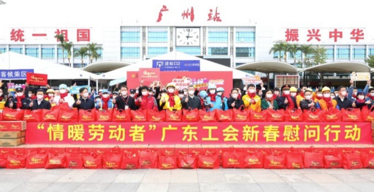 日前,由广东省总工会主办,广州市总工会、越秀区总工会承办的2023年“情暖劳动者”广东工会新春慰问现场活动在广州火车站广场举行,广东工会向慰问现场的网约配送员、环卫工人、建筑工人以及保障春运的保安员、医务人员、公安干警、铁路客运服务人员等职工代表送上新春慰问大礼包。