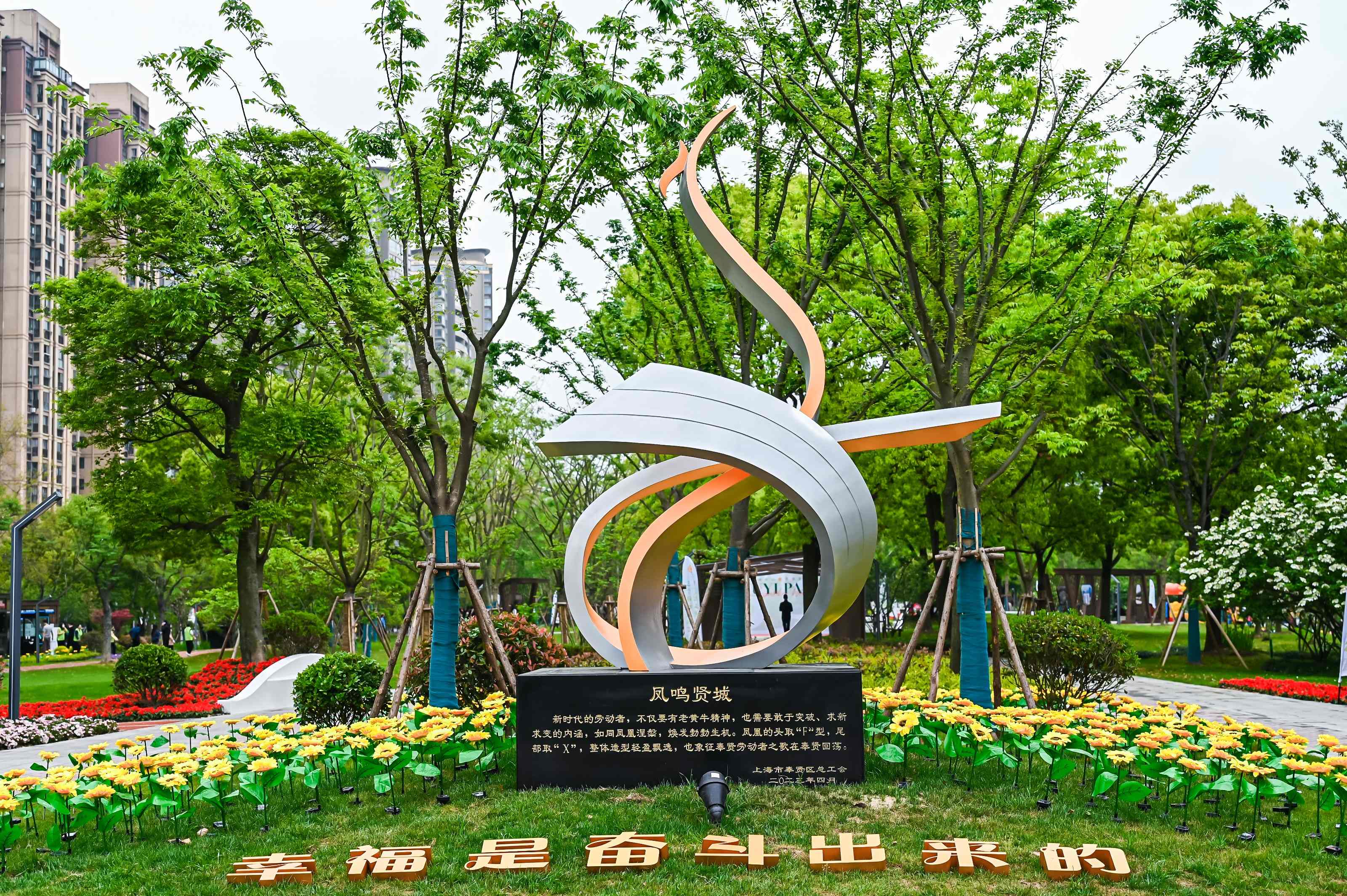 “幸福是奋斗出来的!”公园门口,象征新时代劳动者奋斗形象的“凤鸣贤城”雕塑搭配醒目标志牌匾映入眼帘。这座全市首家以“五一”为主题的公园,位于奉贤新城核心区域,总占地面积约47亩。以劳模为原型的兔子卡通雕塑用视觉语言传达劳模精神、几名少先队员接力劳动的铜雕代表劳动传承、相辅相成的齿轮雕塑寓意工匠精神……公园内随处可见的雕塑、浮雕,将“三个精神”融入景观中,向市民生动地传达“劳动创造幸福,实干成就伟业”的时代精神内涵,也将为奉贤争创国家生态园林城市、国家森林城市添彩助力。