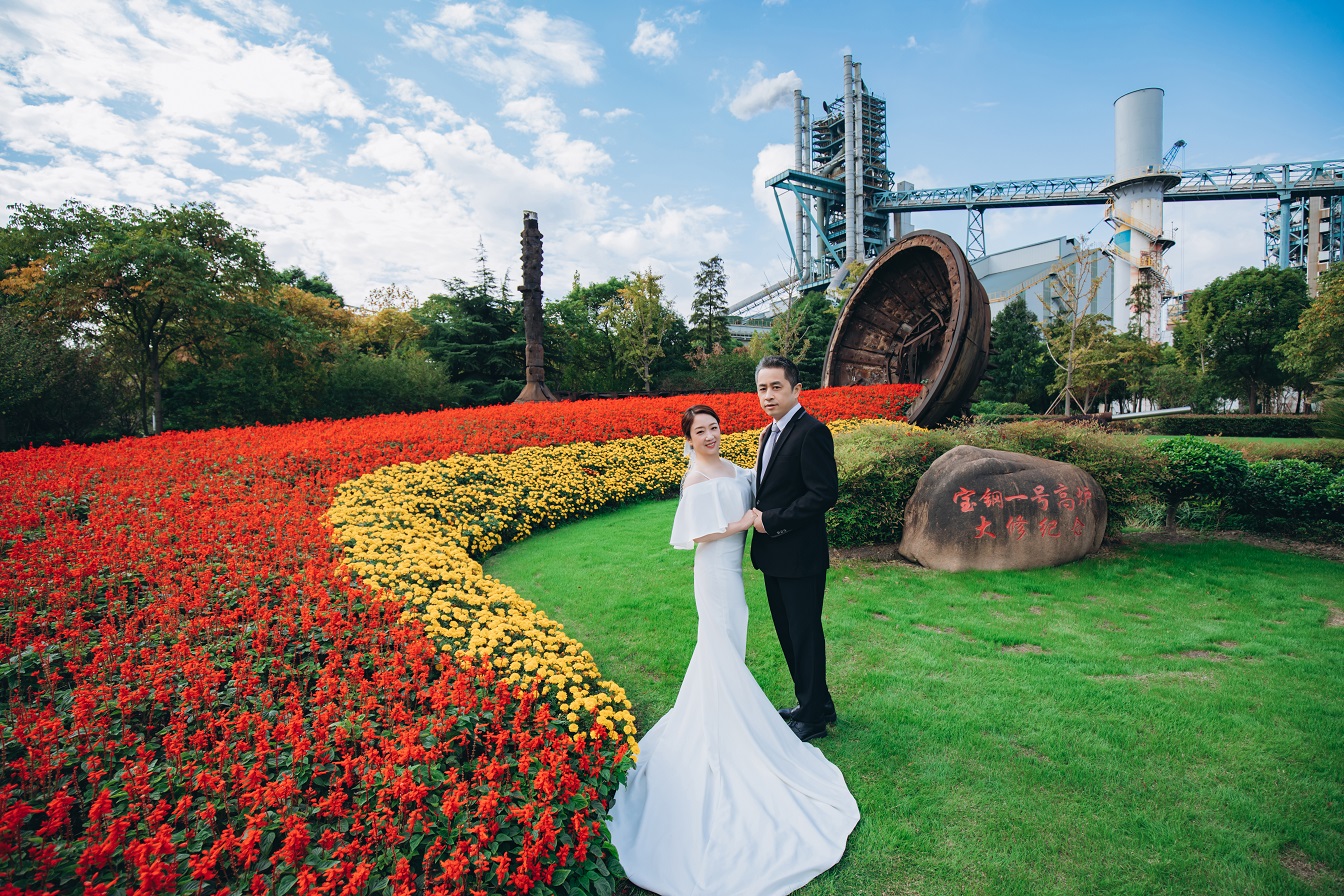 宝钢股份有限公司工会连续三年举办钢铁主题婚纱照,邀请职工与家属共赏花园工厂美景。
