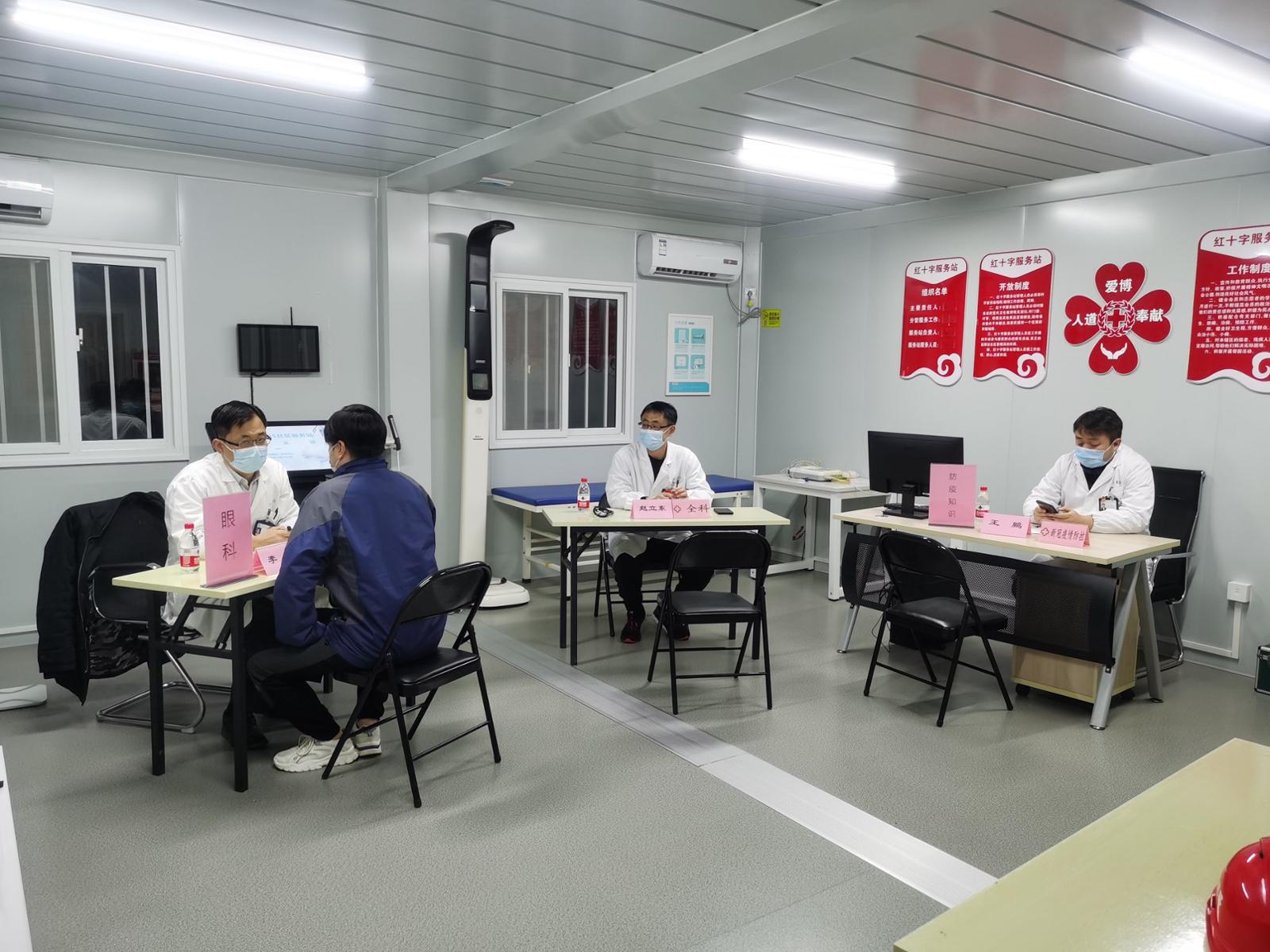 中建八局临港建设者小镇健康小屋内,医生正为职工进行公益义诊。