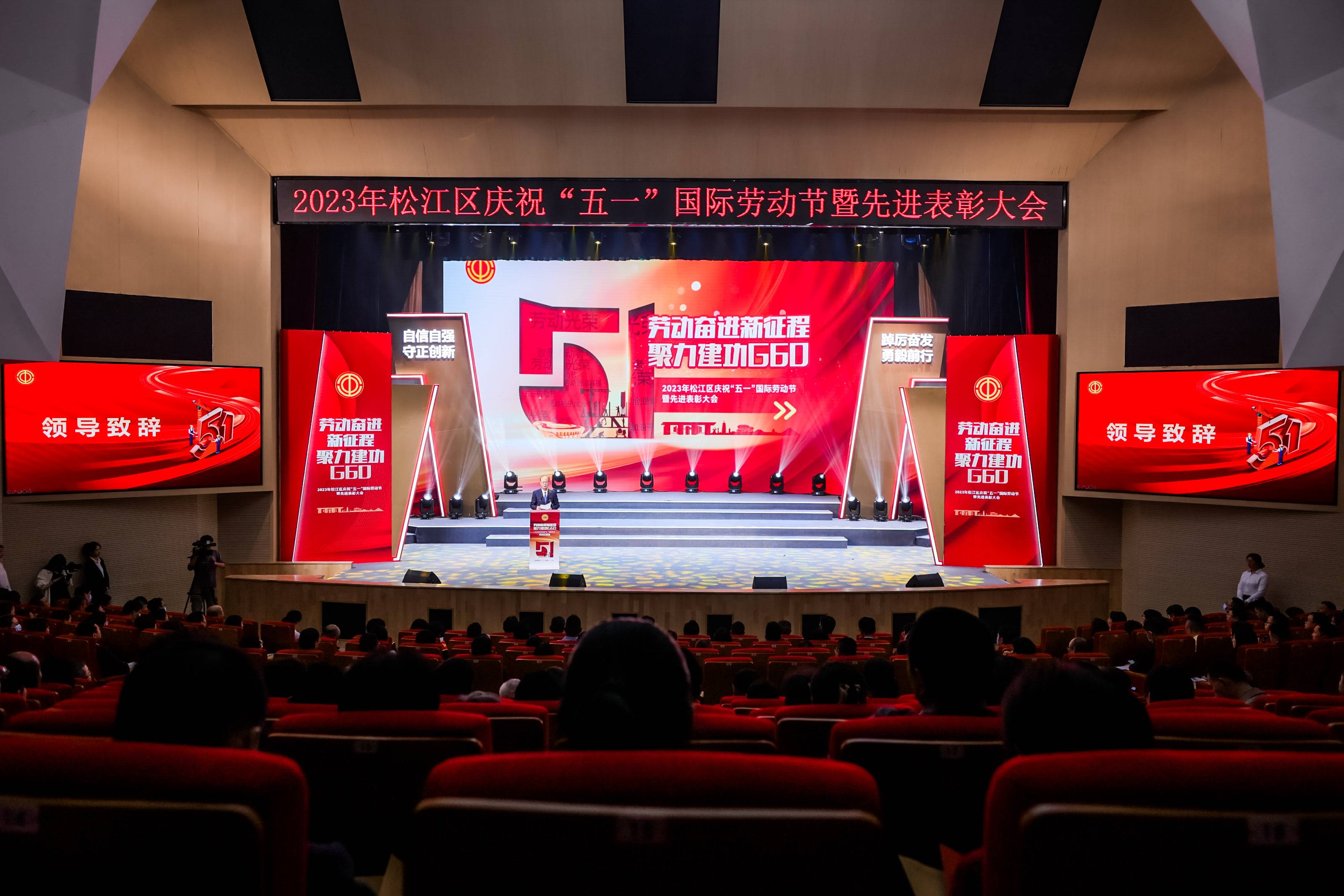 4月28日下午,2023年松江区庆祝“五一”国际劳动节暨先进表彰大会在区工人文化宫召开,本次大会的主题为“劳动奋进新征程 聚力建功G60”。松江区委副书记韦明出席大会并致辞。区委常委、组织部部长时建英宣读松江区建功G60模范集体、先进工作者表彰决定并通报全国、上海五一劳动奖、工人先锋号获奖名单,区人大常委会副主任、区总工会主席吴建良,区政府副区长朱明林、区政协副主席金冬云等领导出席,并为先进集体和先进个人代表颁奖。