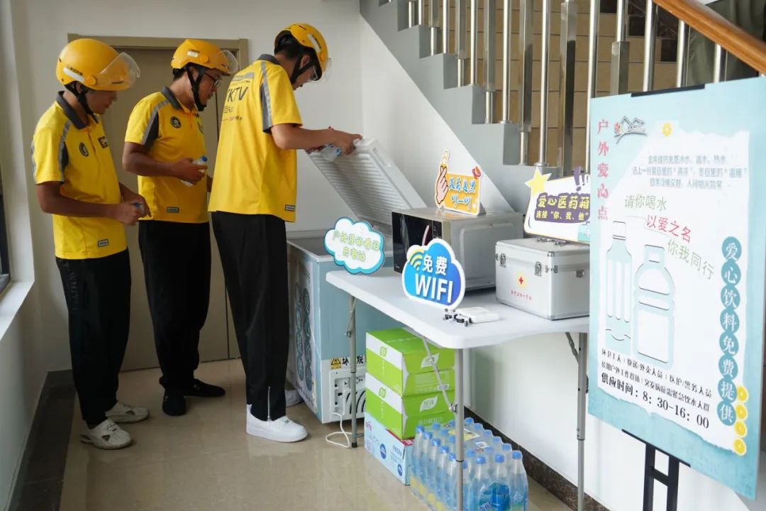 推门而入,丝丝凉意扑面而来,免费冷饮、冰水、温水、热水、微波炉、爱心医药箱、充电宝、数据线等日常所需用品一应俱全,在隔壁的一门式服务窗口内,还为户外工作者准备了不少休憩的座椅,让他们能够在这儿短暂地避暑、休息。