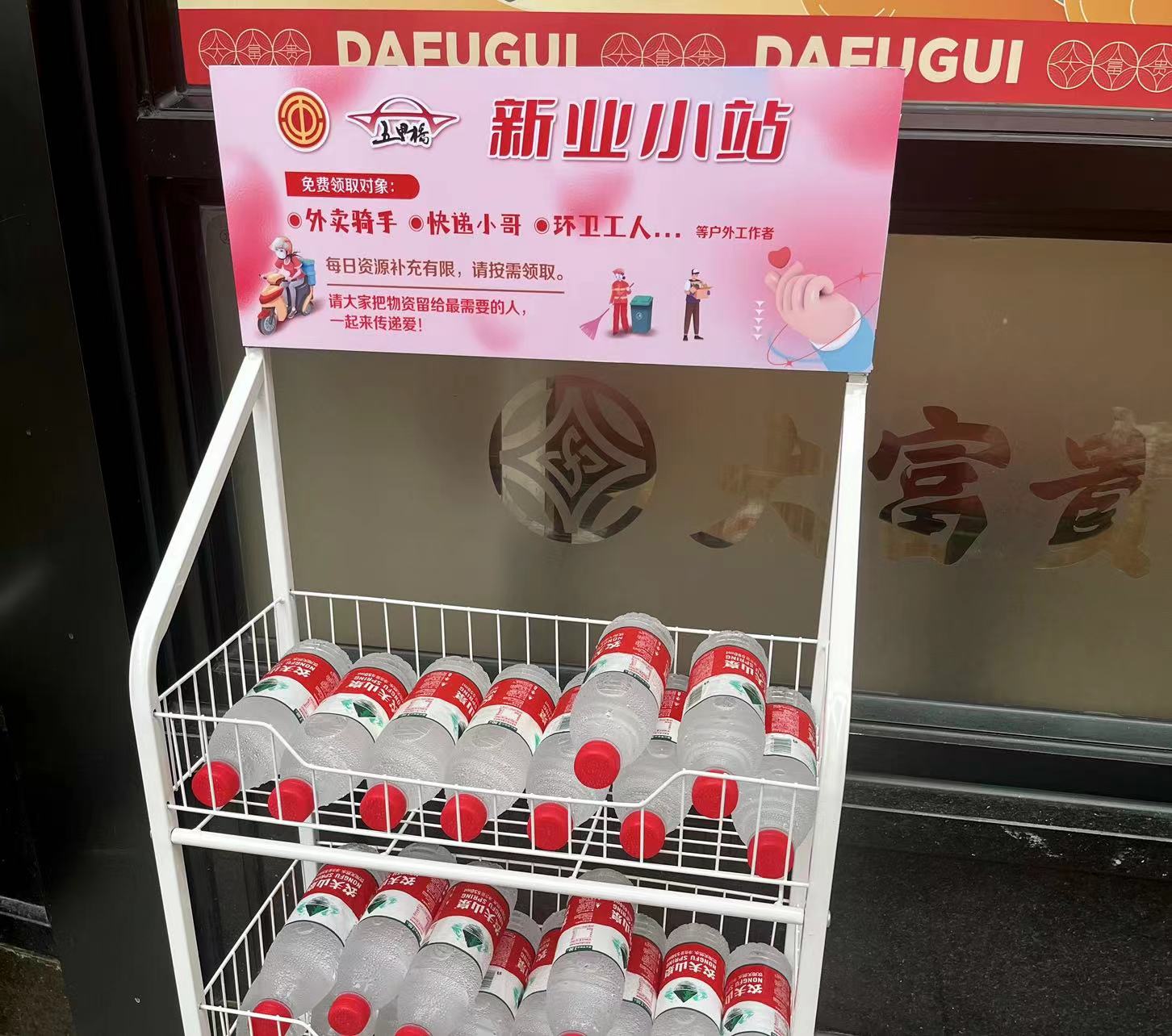 “小哥们在用餐高峰时期,时间特别紧张,很多时候在站点里给他们准备的饮料,也来不及喝上一口。”为了更好关爱忙碌的外卖骑手,五里桥街道总工会推出了一项全新的服务:“新业小站”,街道总工会牵手长者食堂及大富贵、丰裕等知名老字号餐饮企业,在这些餐饮门店的入口处显眼位置放置饮料柜。小哥们可以在取餐的同时,拿上一瓶水。