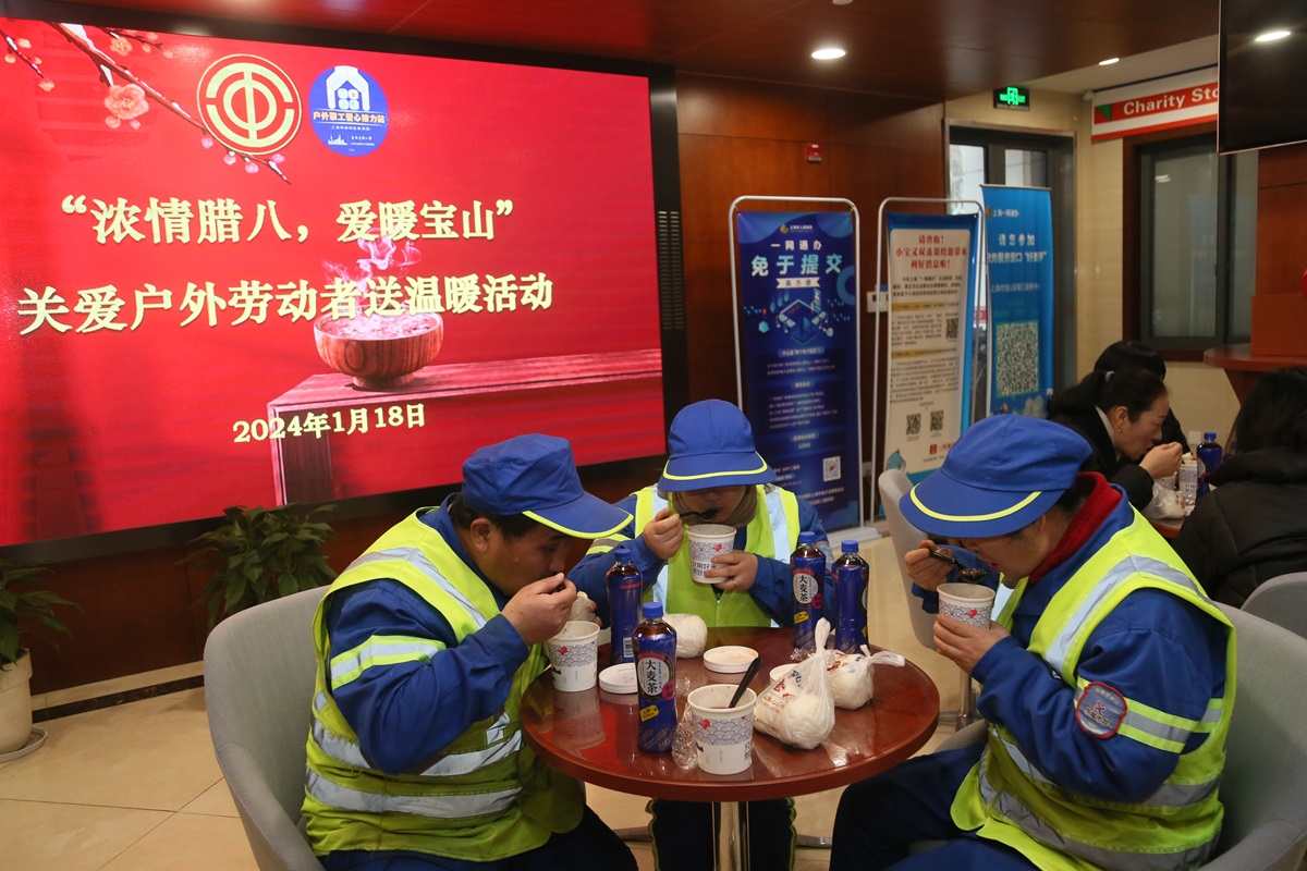 头图:宝山区总工会开展“浓情腊八,爱暖宝山”活动,一大早,软糯的腊八粥和香喷喷的早餐包子令户外职工的胃里、心里都好暖。