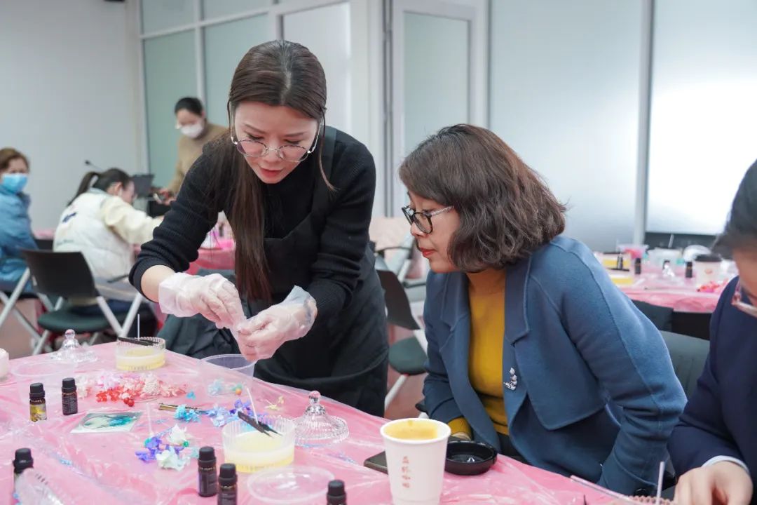 在征集广大女职工意愿的基础上,活动准备了制作香薰蜡烛杯和手工精油皂两个主题。香薰蜡烛杯的制作别有巧思,倒入加热融化的豆蜡,滴入芬芳精油,再在奶白色的蜡液基底上用干花赋予鲜活的色彩和造型,充分体现了大家的想象力和创造力。手工精油皂的制作过程更是充满了创意,在融化的皂基里每滴入一滴颜色,都会调制出意想不到的惊喜,层层精心注模、滴滴香氛精油,亲手制作的每一块香皂都独一无二。活动间隙,工会还邀请“无声咖啡师”现场制作美味咖啡、果茶,以实际行动助力公益爱心事业。