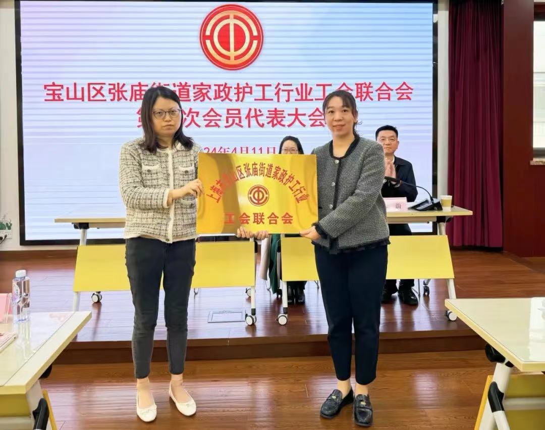 头图:张庙街道家政护工行业工会联合会授牌现场。