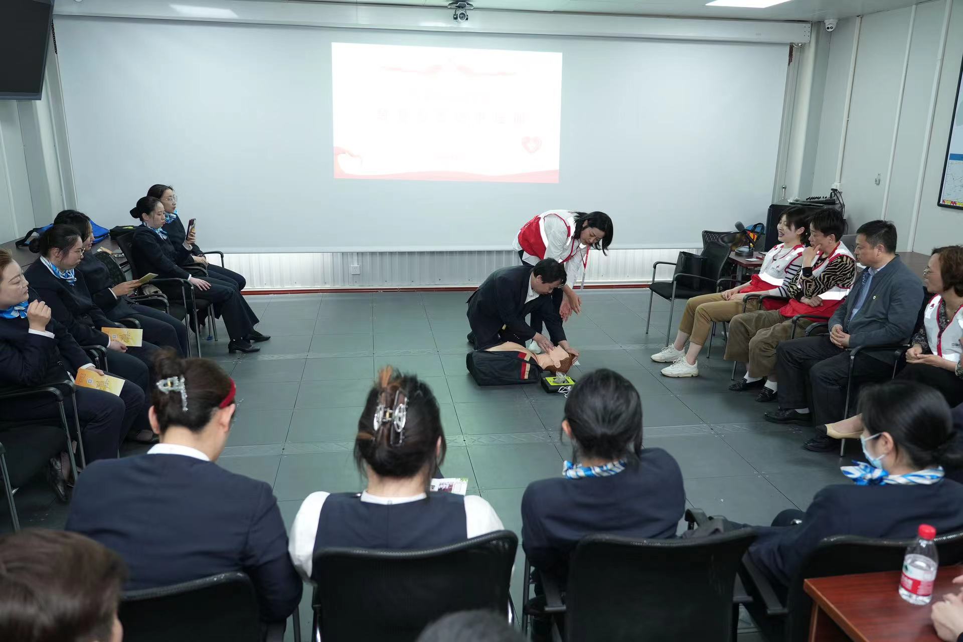 活动现场,授课老师为职工们现场讲解了急救“黄金4分钟”的重要性以及急救技能、流程和注意事项等,并针对现场急救、心搏骤停与心肺复苏、自动除颤仪AED的使用、气道异物梗阻(海姆立克法)、特殊损伤等内容做生动讲述和实操训练。司乘们积极参与其中,主动向老师们学习了心脏按压、简易包扎、心肺复苏等方面的知识,详细了解掌握救急、救护操作的相关技能。对于在操作中存在的问题,授课老师对其进行了逐一指导。
