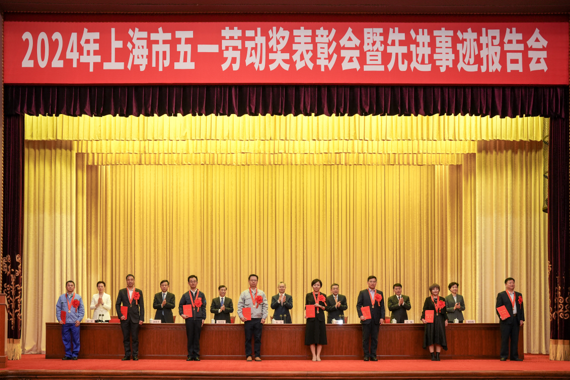 2024年上海市五一劳动奖表彰会暨先进事迹报告会今日在上海展览中心友谊会堂隆重举行,1122个上海市五一劳动奖状、奖章和工人先锋号受到表彰。市委常委、组织部部长张为,市人大常委会副主任、党组副书记、市总工会主席郑钢淼,市政协副主席吴信宝,市委副秘书长燕爽,市政府副秘书长赵祝平,市人社局党组书记、局长杨佳瑛,市总工会党组书记、副主席沈军等为获奖者代表颁奖。