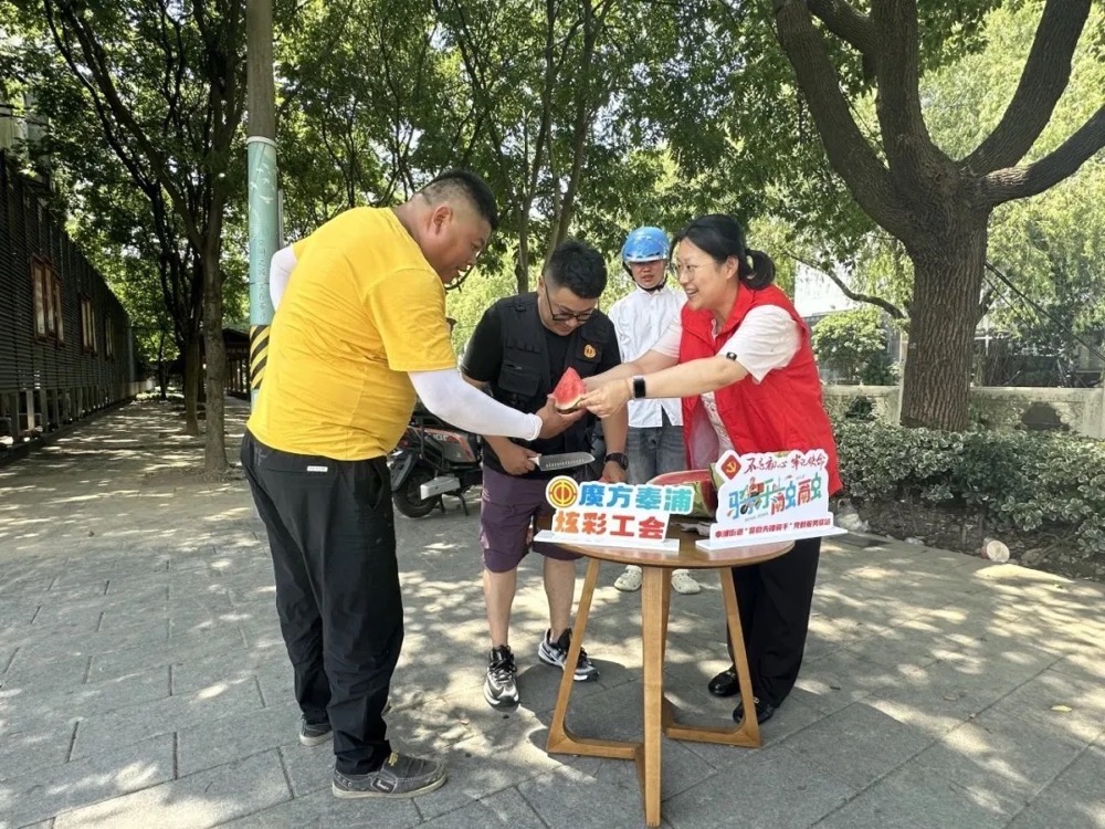 奉浦街道总工会“花式送清凉”,开展共享冰箱行动和“闪现”活动,在商圈、街面、接力站等阵地放置冰柜、饮水架,为户外劳动者提供免费的饮用水;工作人员闪现在户外职工聚集地,如宝龙商圈、韩村路美食街、户外职工爱心接力站,为他们送去清凉可口的西瓜。