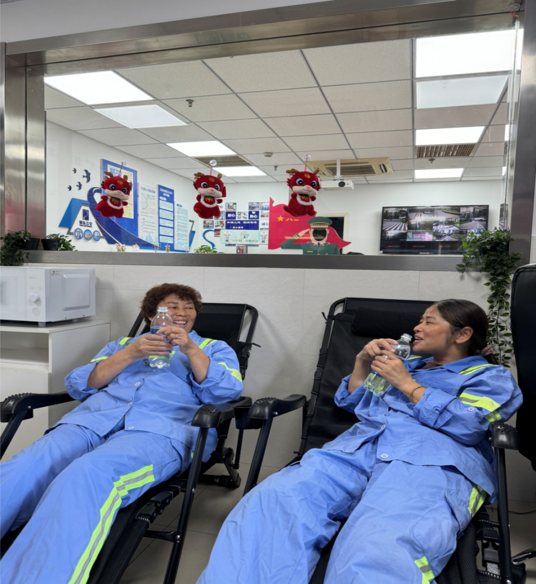 大桥六线站点户外职工驿站里,环卫工人王小妹、伍大姐正借着午休的时间舒适地在驿站躺椅上休息,线队管理人员夏队热情地请他们吃西瓜和冷饮,并叮嘱她们一定要注意防暑降温,加强自身保护,有空多来驿站吹吹空调。