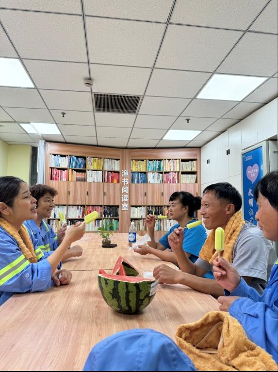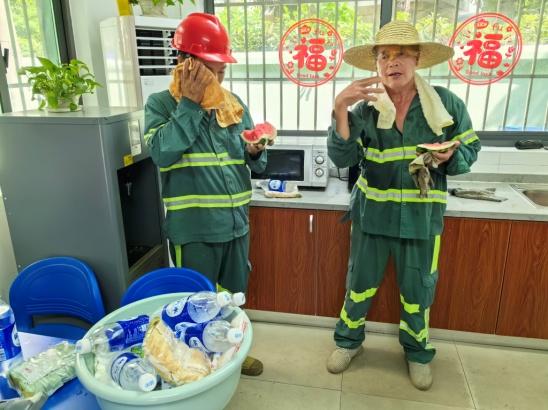 “能在这么热的天气吃到一口凉爽清甜的西瓜真的是感觉好极了!”年近50的环卫工人周阿姨边吃着西瓜边感叹道。虽然已到立秋,但上海户外依旧热浪滚滚,“烤”验着户外工作者们的身心。为了让快递员、环卫工人、外卖配送员等户外劳动者能在高温天气下平安作业,杨高公交工会积极行动,在陆家嘴连廊公交枢纽站户外职工爱心接力站、长岛路85路站点户外职工驿站、周浦东站枢纽站户外职工驿站和大桥六线站点户外职工驿站相继开展高温送清凉活动。