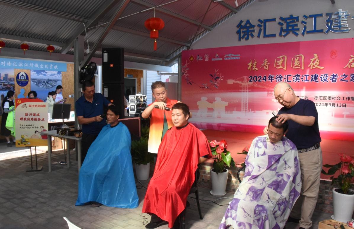 为了配合滨江建设者的新家重启,9月13日下午,徐汇区职工幸福直通车公益市集带着琳琅满目的商品驶入这里,开设新就业形态劳动者专场,将贴心的工会服务和实惠的商品带到广大建筑工人身边,让他们开心地度过中秋佳节。考虑到周边购物、交通不便,建设者们又是“两点一线”,日常所需用品购买非常不便,区总工会精挑细选合适的商户和商品,衣服、毛巾、洗浴用品、食品等一应俱全,满足“吃、穿、用”等多方面需求。直通车现场人头攒动,一元一双的袜子、十元一瓶的洗发膏……实惠的价格让建设者们纷纷把近期所需物品全部备齐,满载而归。除了公益市集,现场还提供了便民理发服务、扫码入会、互助保障宣传等众多工会暖心服务。理发服务深受建设者们喜爱,理发师忙到一刻不停,感慨“今天我已经数不清剃了多少个头了。”工友们热切回应:“你们还会来吗?最好每个月都来”。