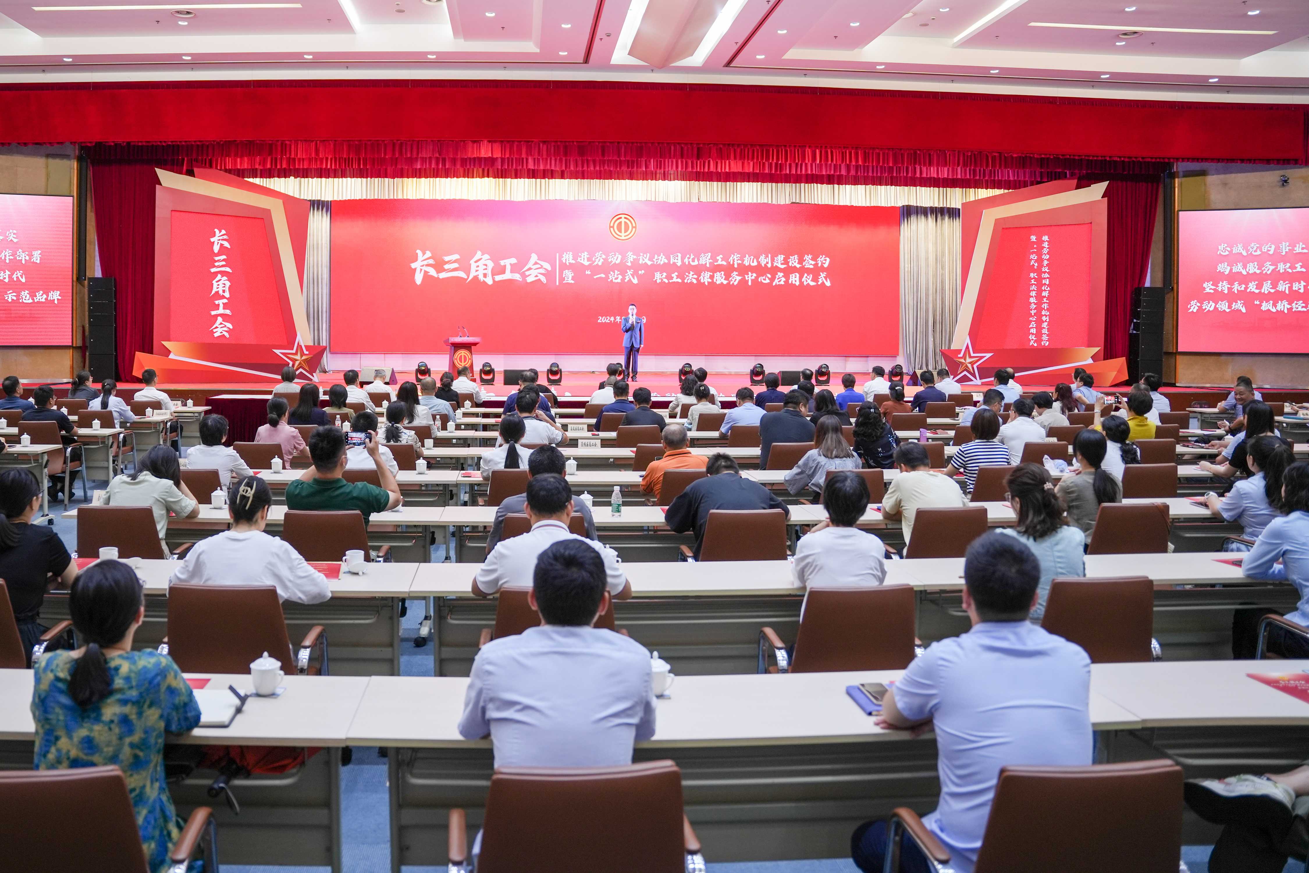 2021年,职工王某受雇于平湖市广陈镇老板,在金山区廊下镇的工地不慎受伤,在接到王某的求助后,廊下镇总工会对其开展法律援助,并通过廊下镇“工会+三所联动”调解室和广陈镇人民调解委员会的共同努力,这起工伤事故得以解决。从昨日起,跨区域劳动争议化解更加“有章可循”,在前期充分研究会商的基础上,上海市总工会、江苏省总工会、浙江省总工会、安徽省总工会共同签订《关于共同打造新时代“工会枫桥”品牌深化区域一体化劳动争议协同化解工作机制建设的协议》(以下简称《协议》)。作为上海工会打造“工会枫桥”示范点培育工作的又一创举,金山区、宝山区2家“一站式”职工法律服务中心同步启用。中华全国总工会副主席、书记处书记、党组成员钟洪江,上海市总工会党组书记、副主席沈军,中共金山区委书记刘健,中华全国总工会法律工作部副部长朱艳丽,上海市总工会副主席赵德关,浙江省总工会副主席施科,安徽省总工会副主席张勇,江苏省总工会二级巡视员缪建华等共同见证。