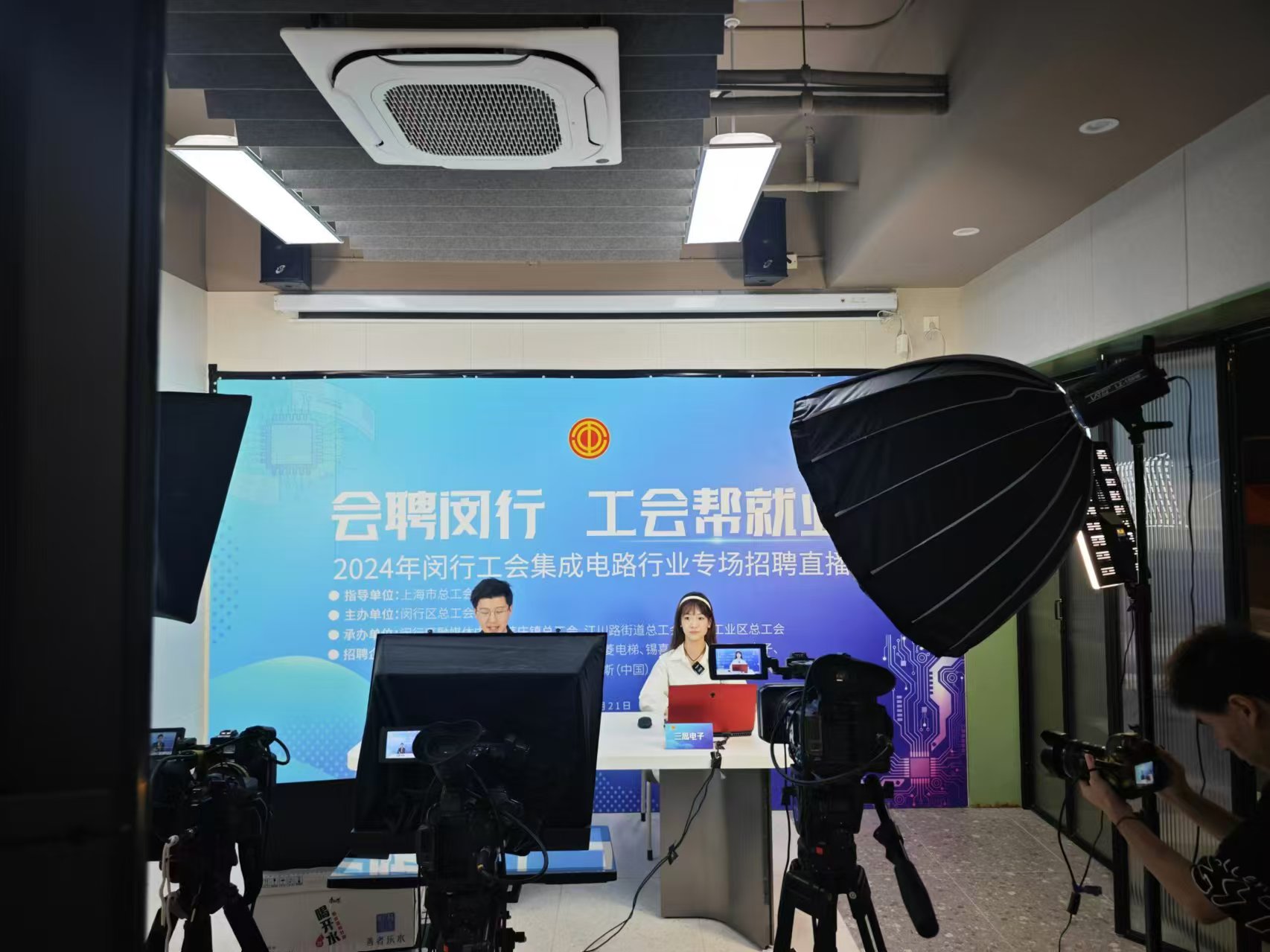 “让我们来看看下一家企业的介绍,3、2、1!”9月21日下午,由闵行区总工会主办的“会聘闵行,工会帮就业”2024年闵行工会集成电路行业专场招聘直播活动在“今日闵行”视频号、“今日闵行”APP和“申工社”视频号同步直播。活动吸引了闵行区众多优质的集成电路企业,三思电子、元一电子、季丰电子、康谨电子、龙旗智能科技、光织科技、锡喜材料科技、泰则半导体、奥特斯(中国)、跃菱电梯等10家企业参与其中,现场发布了37个热门岗位,预计招聘116人。