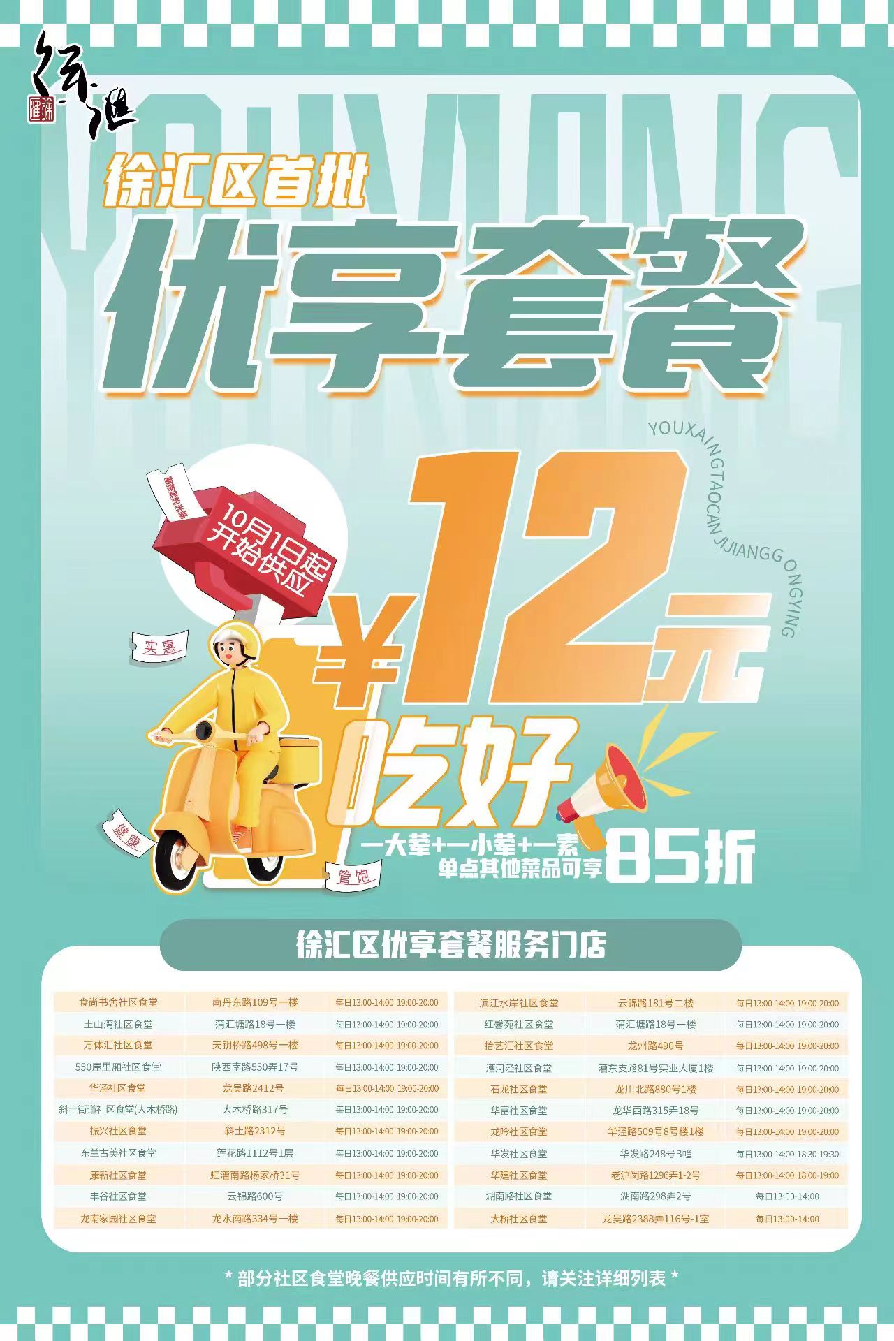 一盆绿油油的炒蒜苗、一份食堂最为火爆的蛋炒蚕豆、一整条清蒸鱼,今天中午,叮咚买菜配送小哥在康健街道社区食堂幸福开餐。这份仅向小哥开放的优享套餐仅售12元,即可享受一大荤、一小荤和一素菜。自10月起,徐汇区首批面向小哥的优享套餐,在全区22家社区食堂开餐,就餐无门槛,小哥凭工服可以直接进入享受套餐。